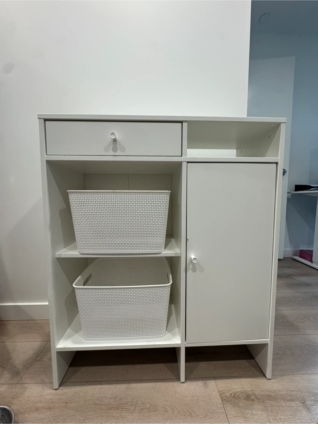 This white storage cabinet offers a drawer and a cupboard space. It has open shelving and comes with two white woven baskets.