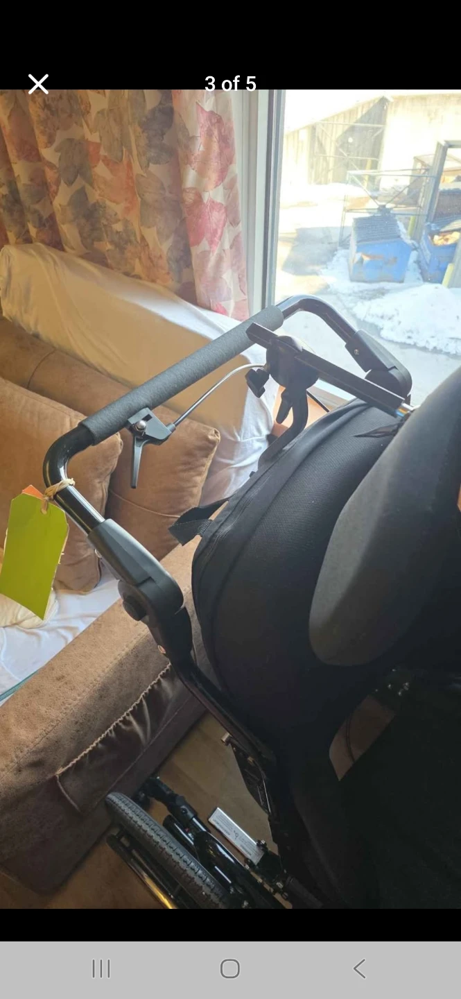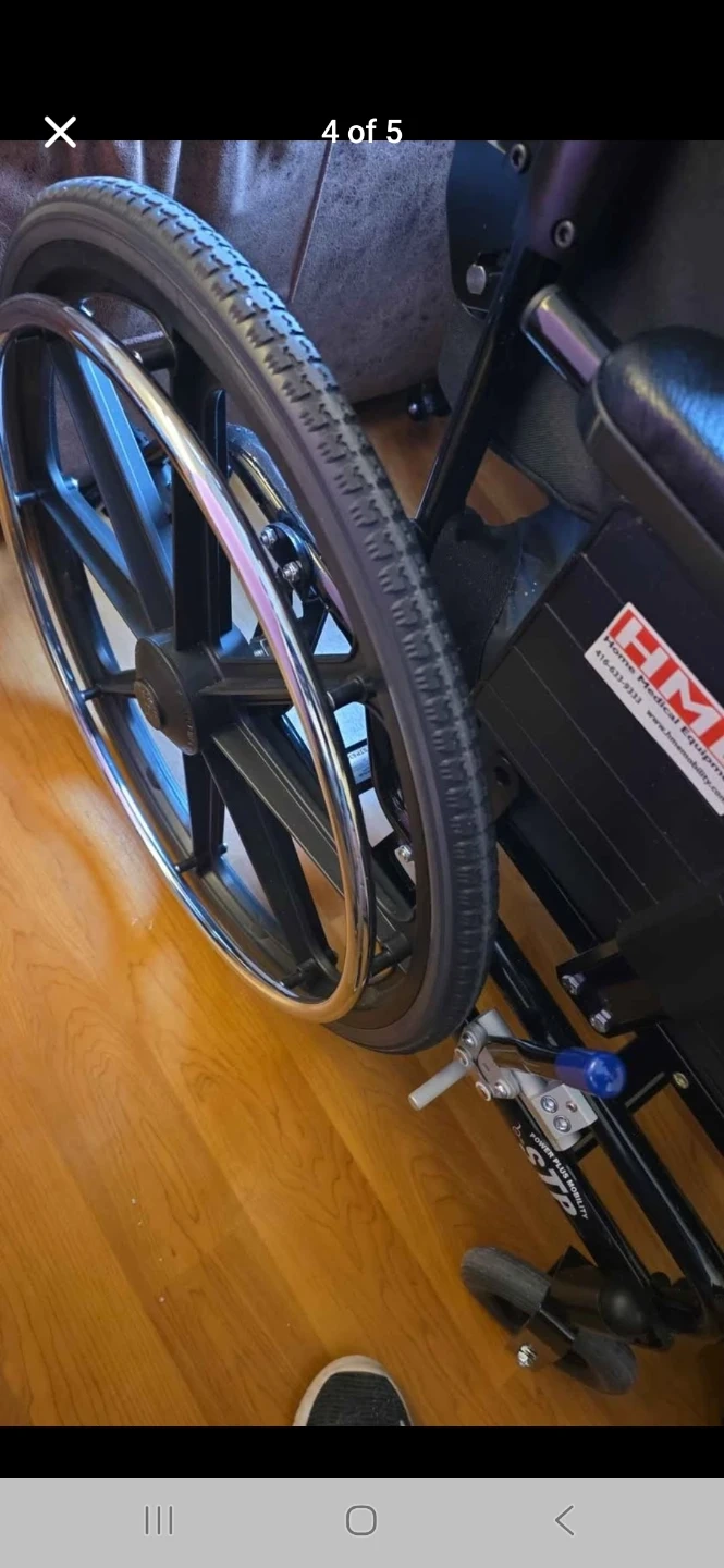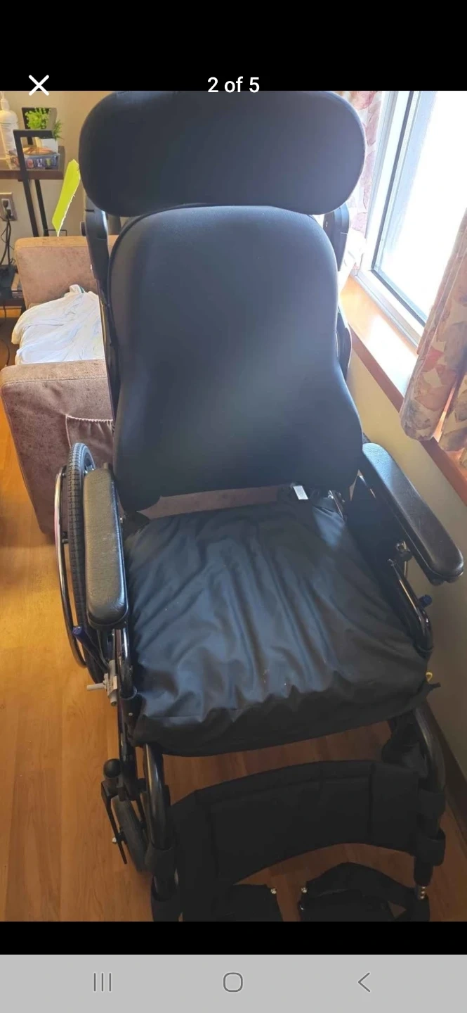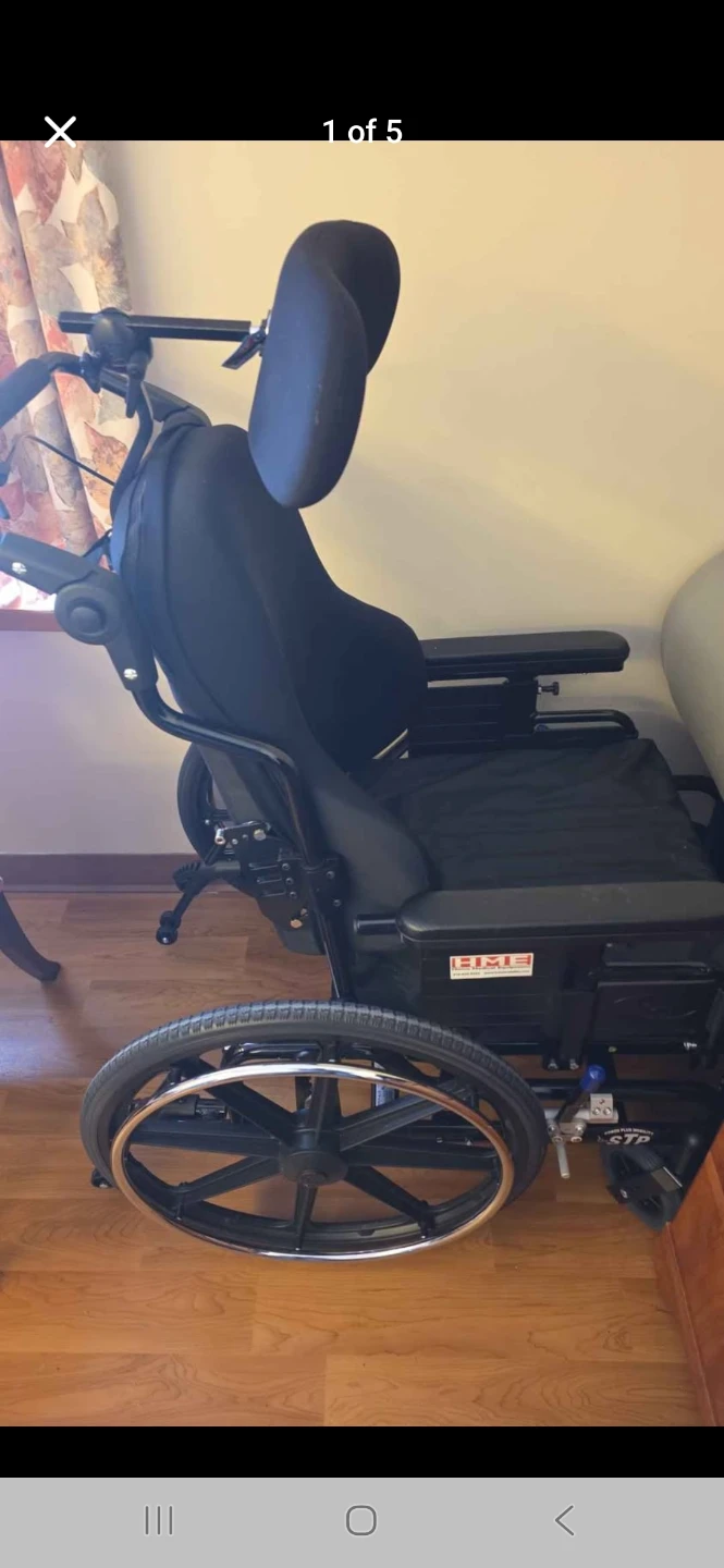 This is an HME pediatric tilt-in-space wheelchair, model STP-1818. It features adjustable footplates and a ROHO pump cushion. The seat depth is 16".