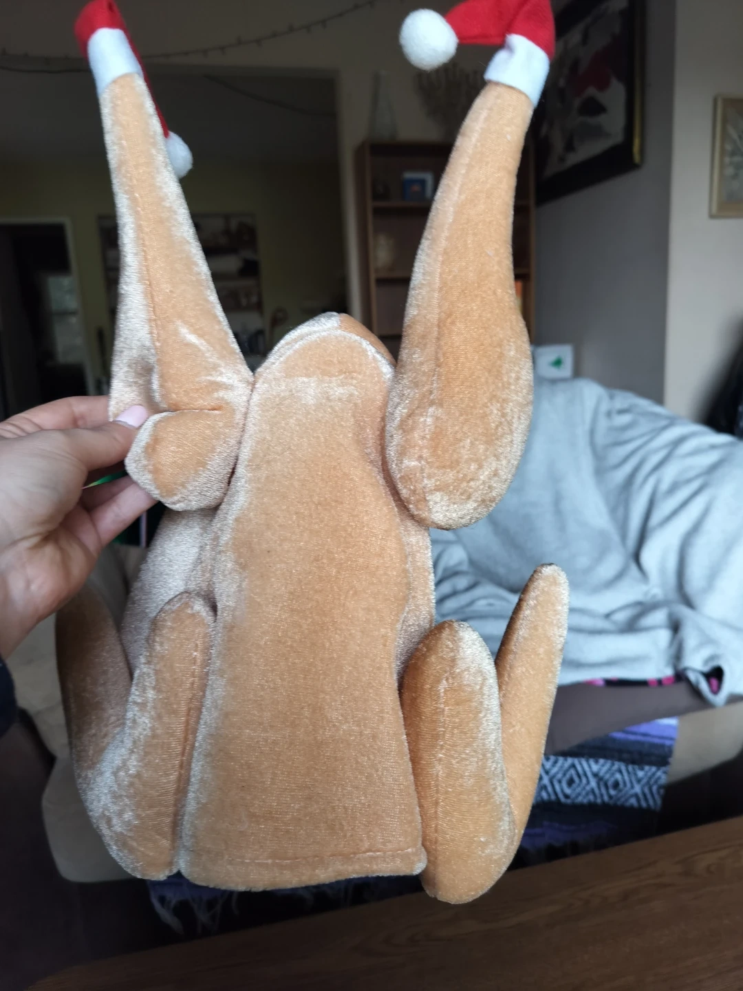 It's a novelty hat shaped like a turkey with little Santa hats on the ends of the legs. The material is a soft, velour-like fabric. Perfect for holiday parties and making everyone laugh! Adult size.