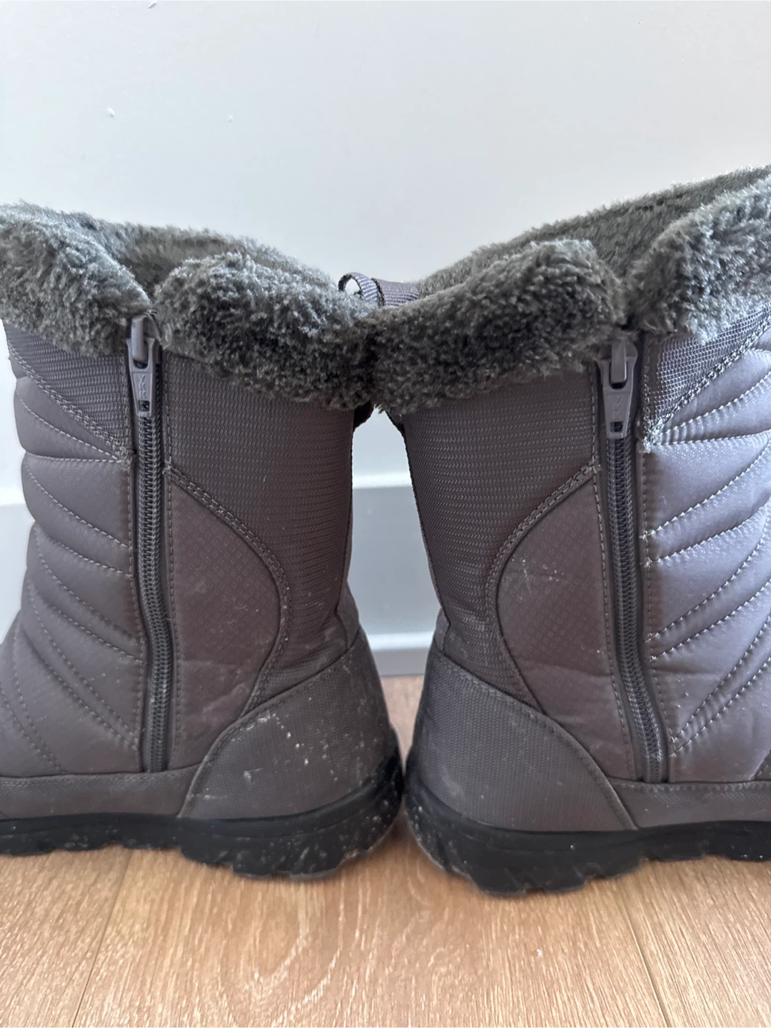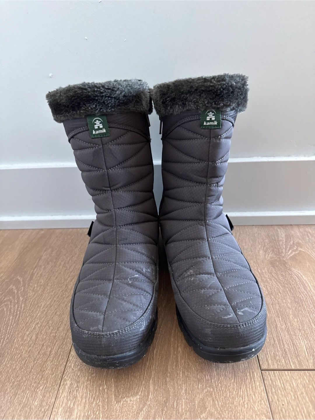 Kamik Hannah Zip winter boots in grey. These boots feature a quilted nylon upper with a faux-fur trim. They have side zippers for easy on and off.