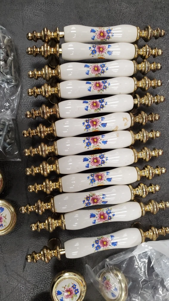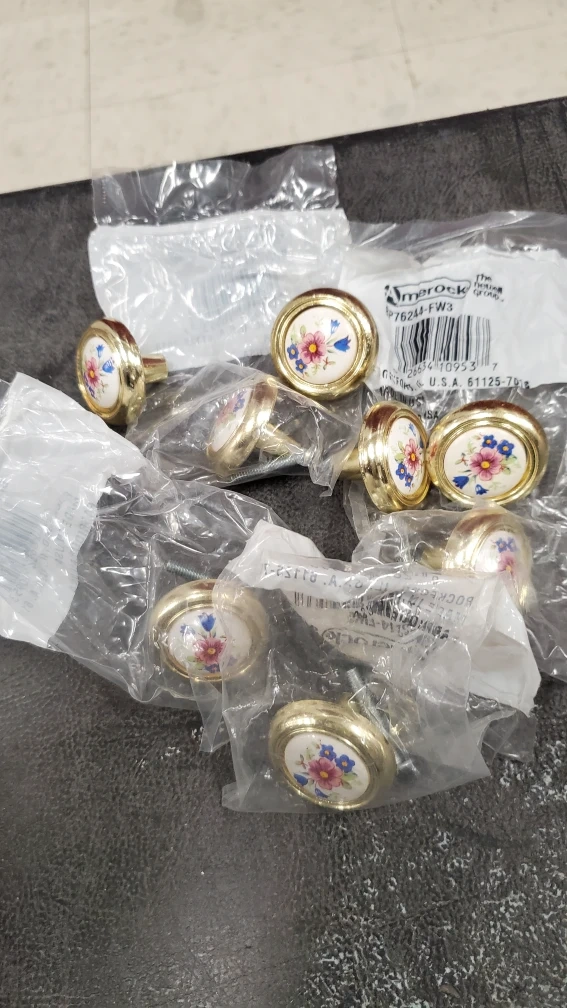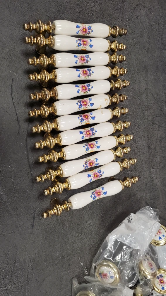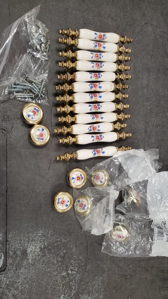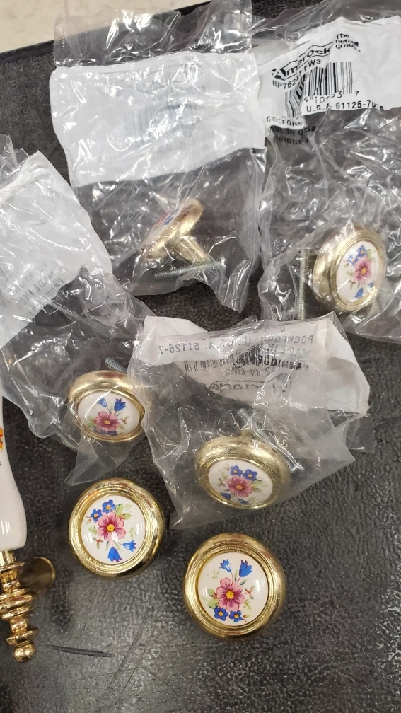 Selling a set of Amerock cabinet knobs and pulls with a floral design. They appear to be in good condition and some are still in their original packaging. Great for adding a touch of vintage charm to your cabinets or drawers