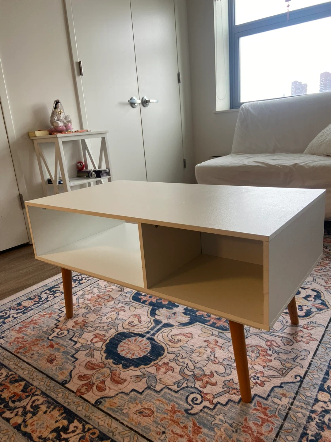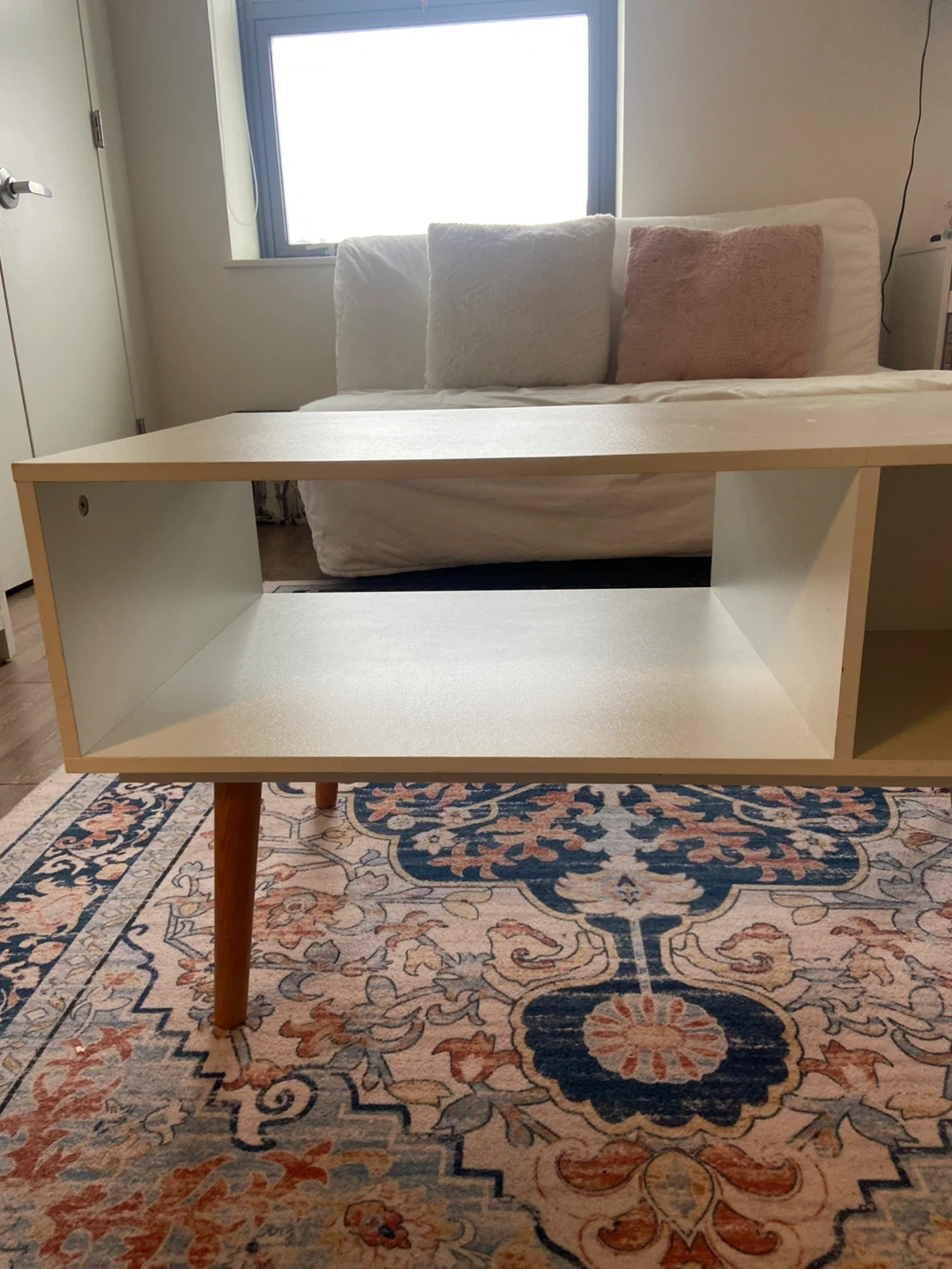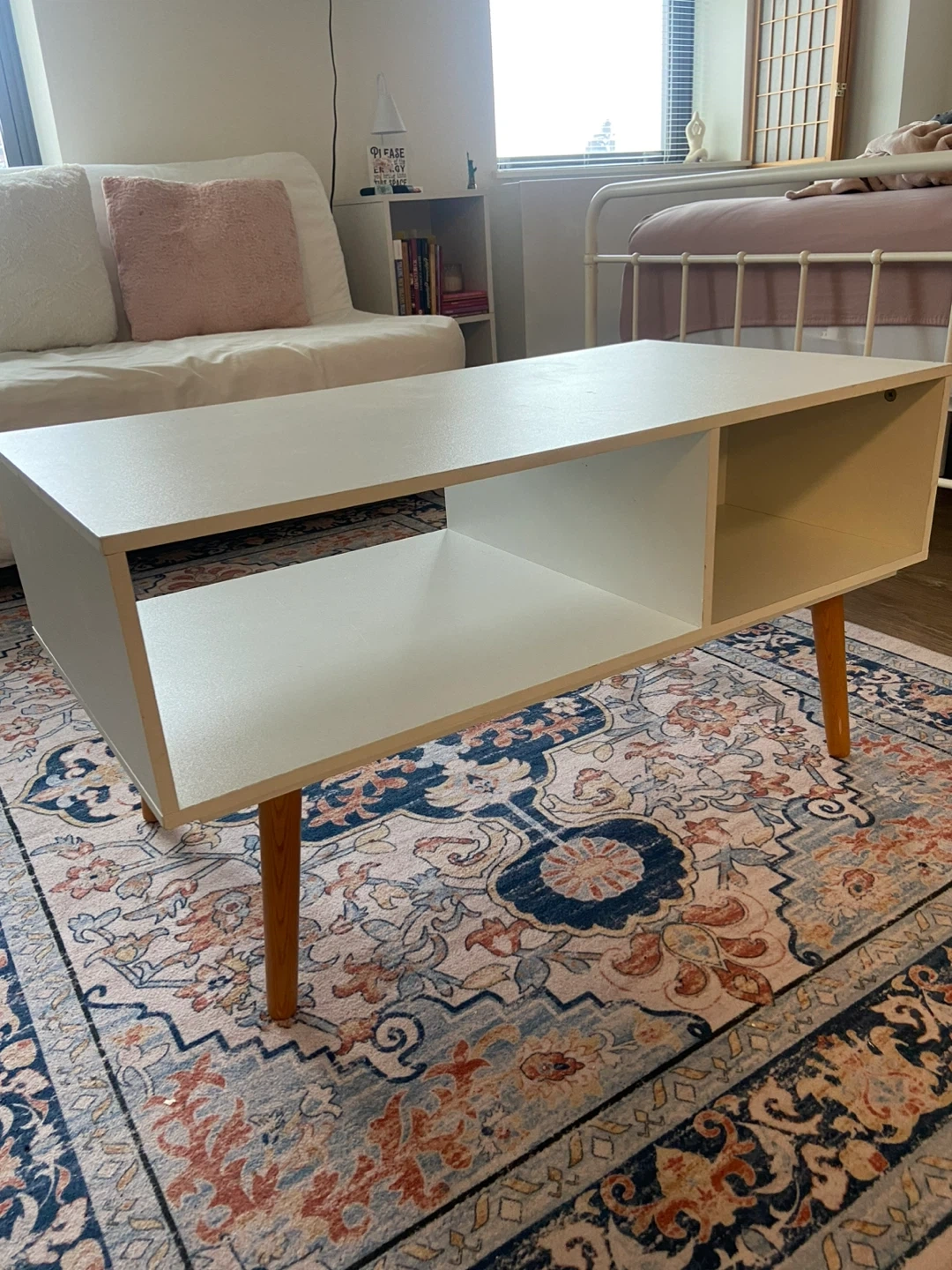 Selling a cute coffee table! It's white and has a cool, modern design with open storage on one side. The legs are made of wood. It's in great condition and would look great in any living room