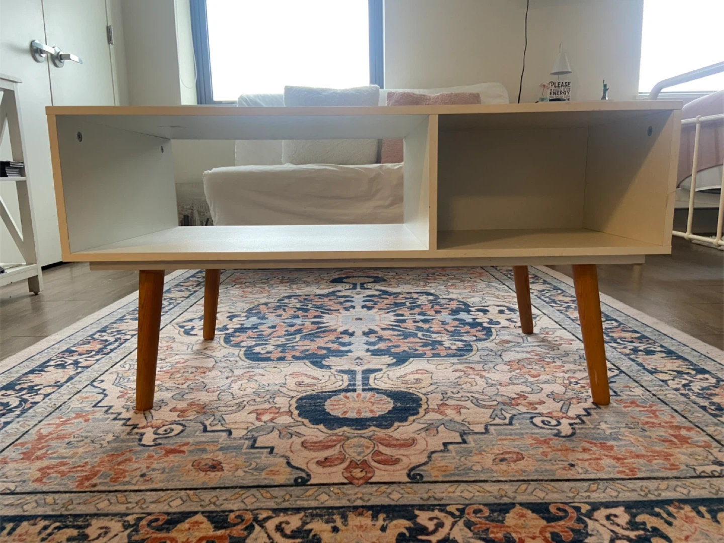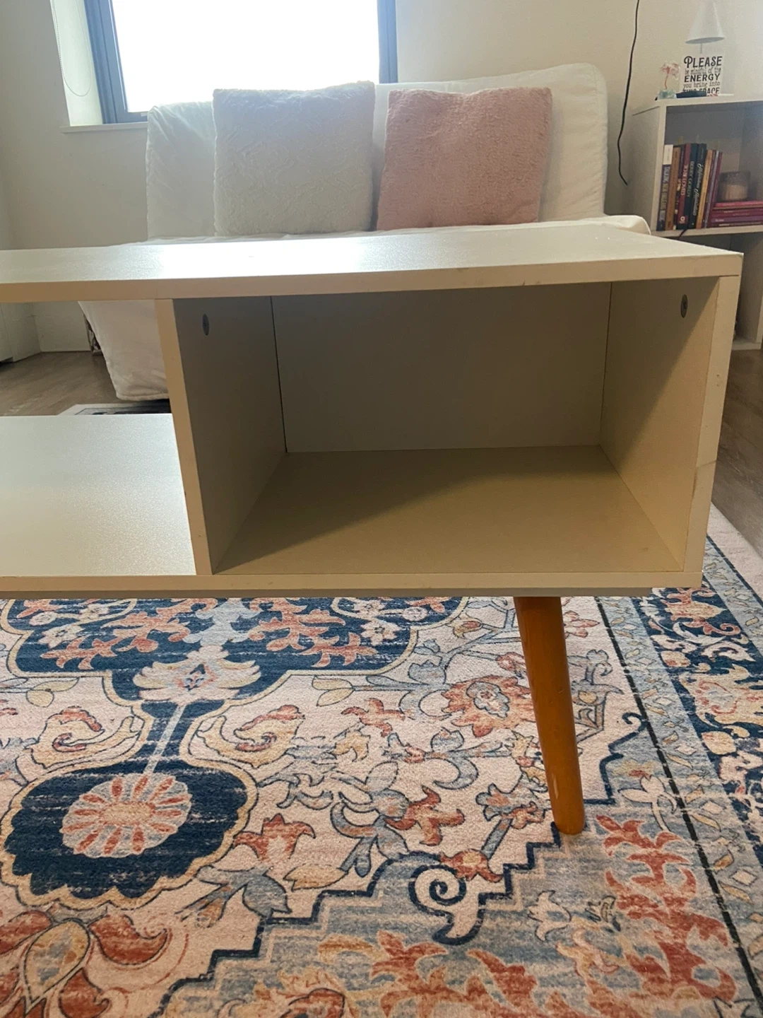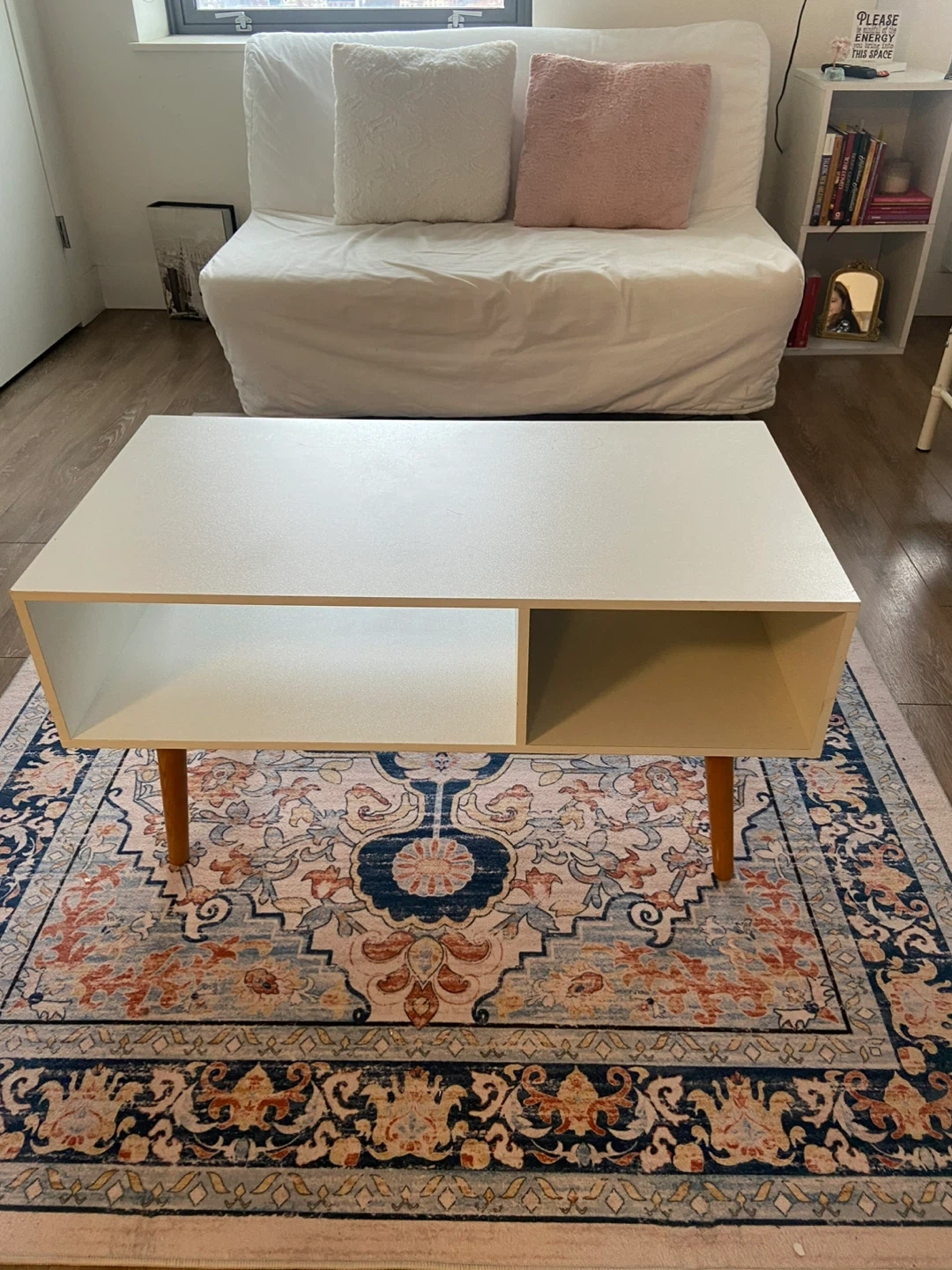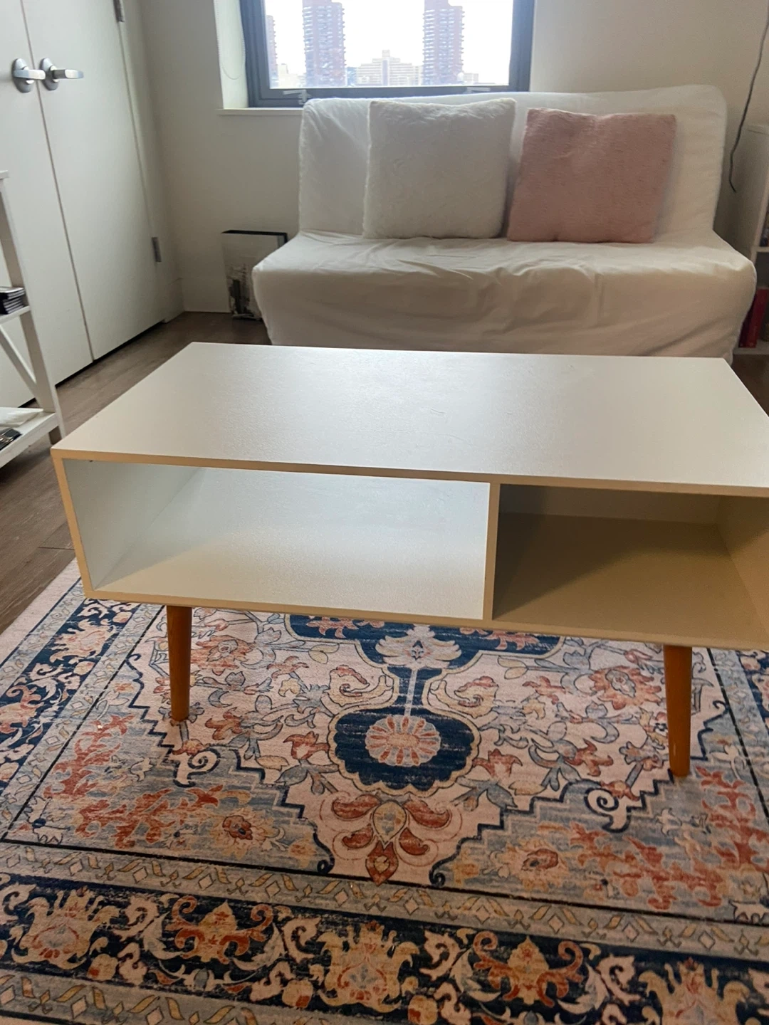 Selling a cute coffee table! It's white and has a cool, modern design with open storage on one side. The legs are made of wood. It's in great condition and would look great in any living room