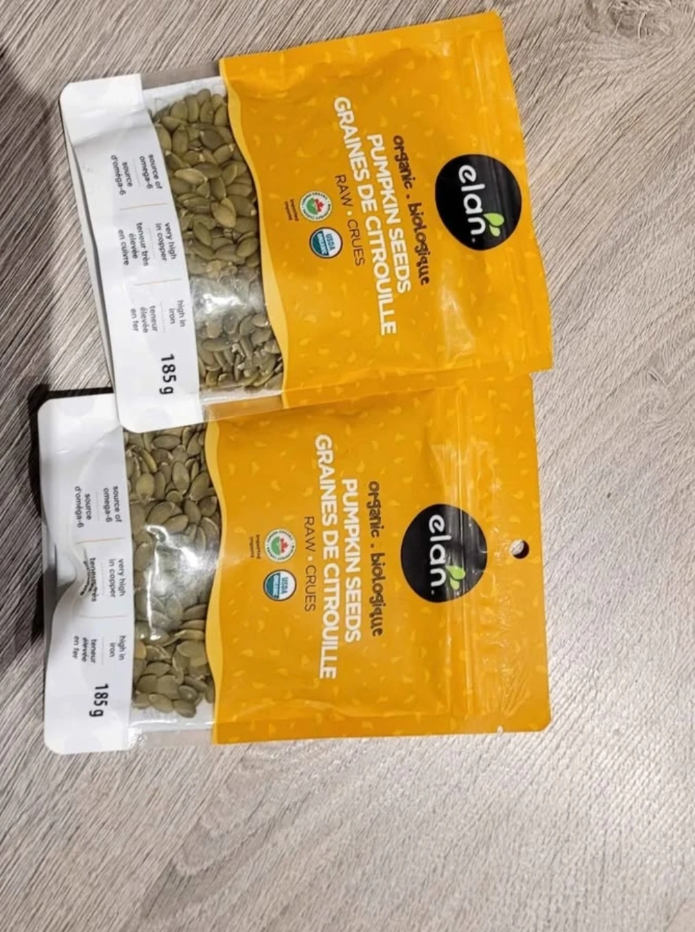 Giving two bags of Elan Organic Pumpkin Seeds! Each bag contains 185g of raw pumpkin seeds. They're a great source of omega-6 and high in both copper and iron