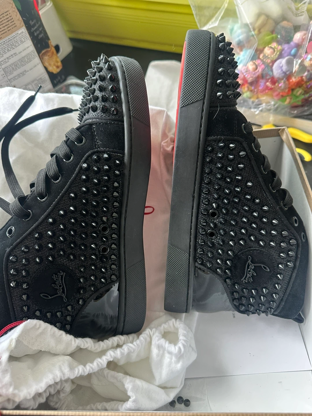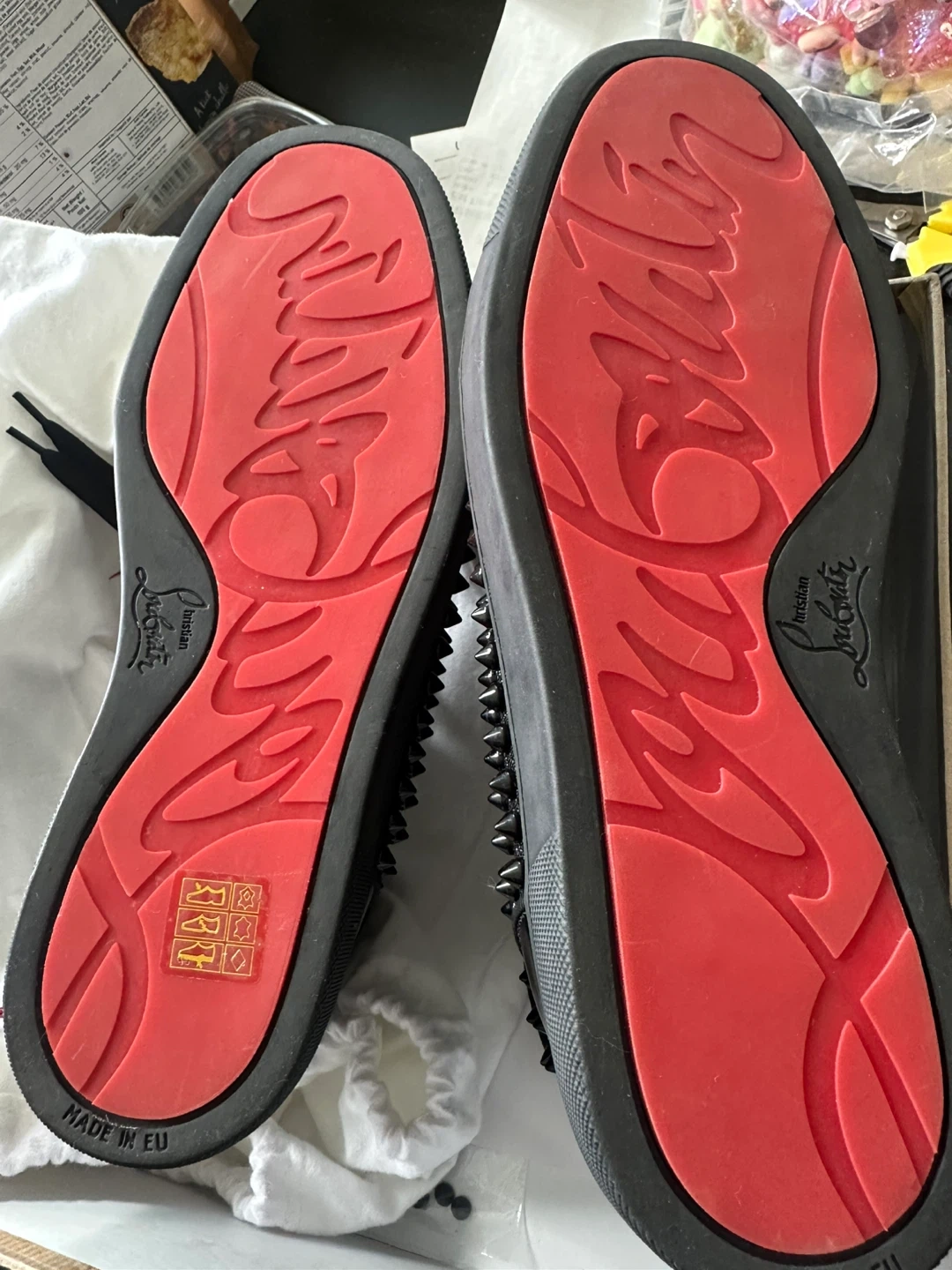These Christian Louboutin sneakers are black with allover spikes. They're size 41.5. Made in EU.