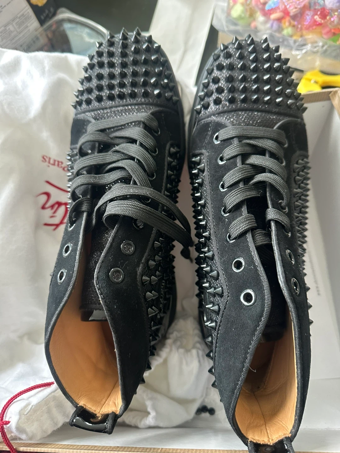 These Christian Louboutin sneakers are black with allover spikes. They're size 41.5. Made in EU.
