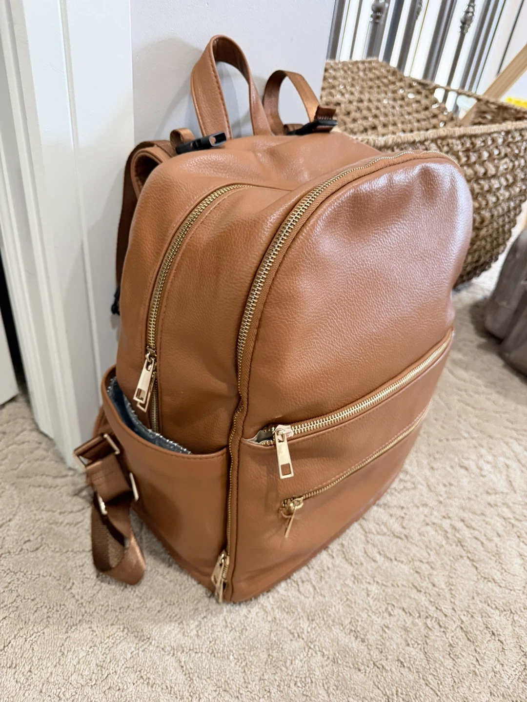 A stylish brown faux leather backpack with gold zippers. It features multiple pockets for organization. This bag's versatile design makes it suitable for everyday use or travel