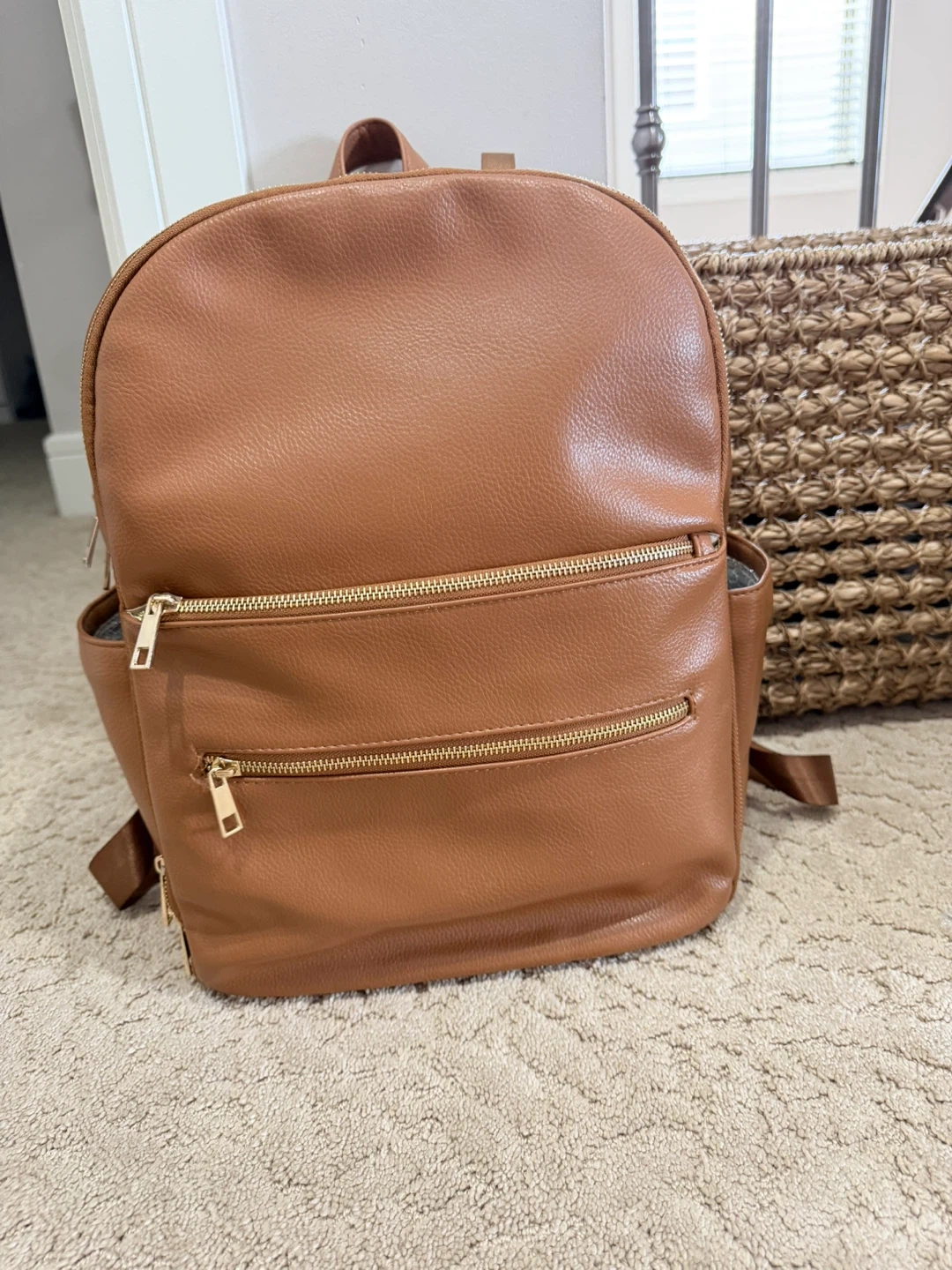 A stylish brown faux leather backpack with gold zippers. It features multiple pockets for organization. This bag's versatile design makes it suitable for everyday use or travel