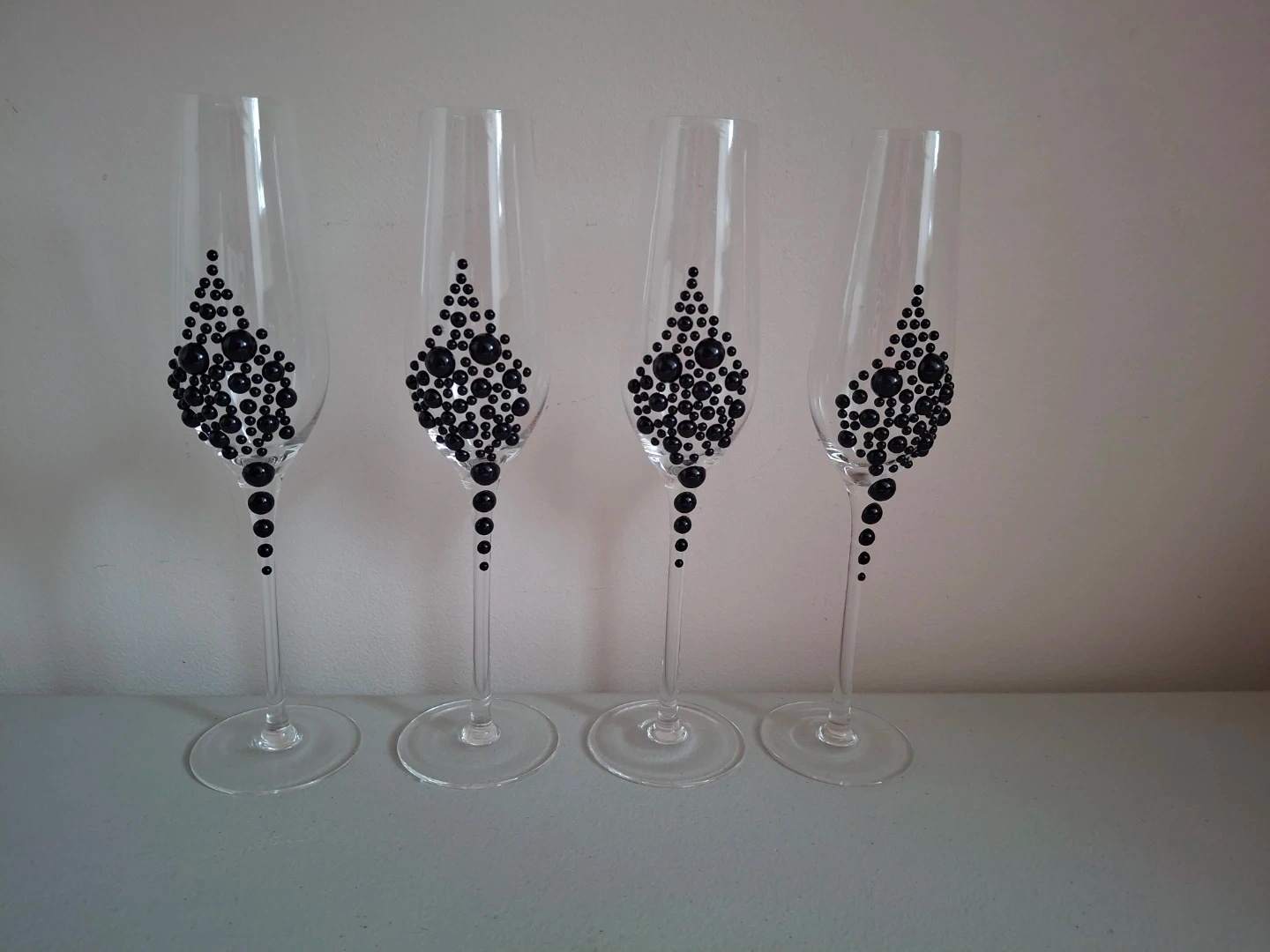 Selling a set of four elegant champagne flutes. Each glass features a unique, scattered pattern of black bead-like embellishments along the stem and bowl. These would be perfect for celebrations or adding a touch of sparkle to your table!