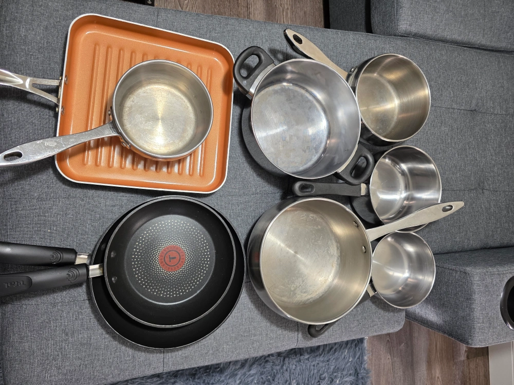Selling a collection of used pots and pans, including pieces from T-fal and other brands! Great for anyone looking to expand their cookware collection or replace some older items. They've been well-used but still have plenty of life left in them. Perfect for everyday cooking!