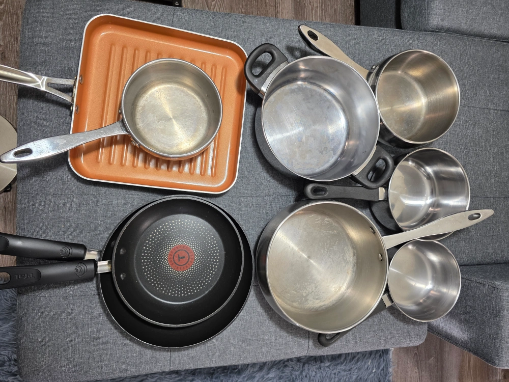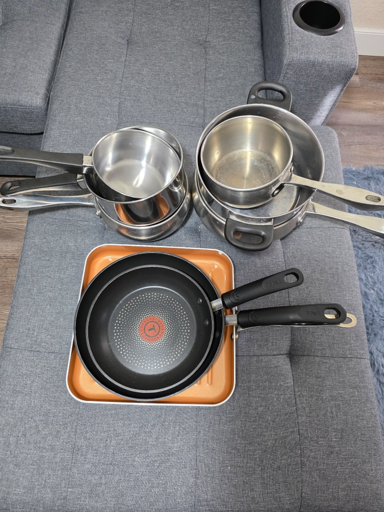 Selling a collection of used pots and pans, including pieces from T-fal and other brands! Great for anyone looking to expand their cookware collection or replace some older items. They've been well-used but still have plenty of life left in them. Perfect for everyday cooking!