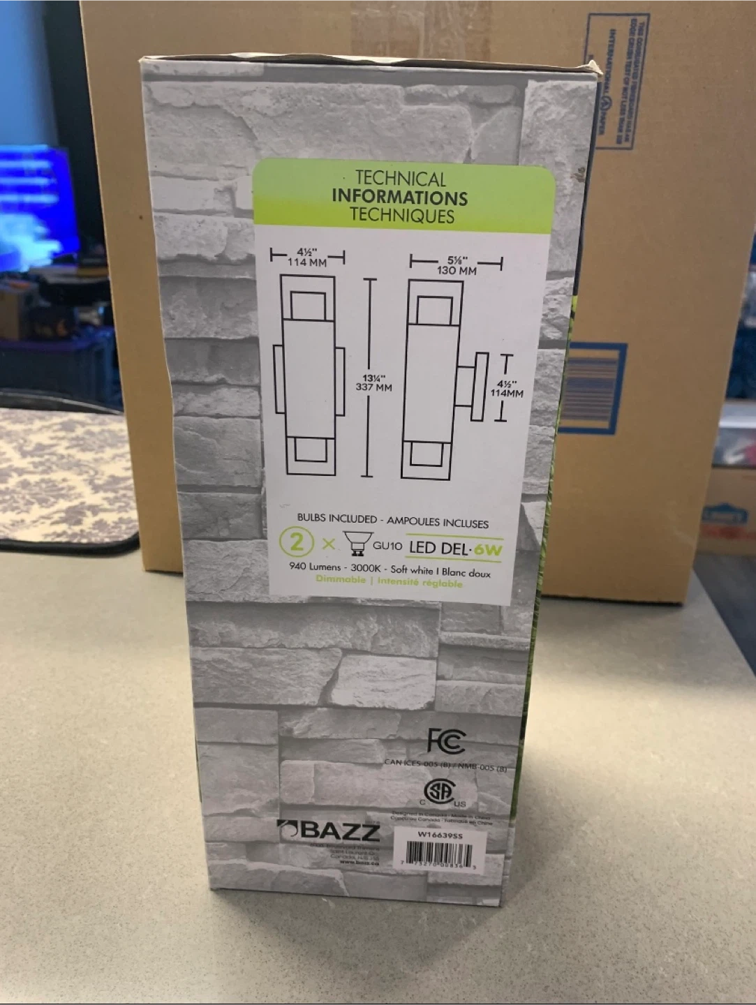 This Bazz Luvia outdoor wall light fixture comes with 2 GU10 LED bulbs. It provides 940 lumens of soft white light. The fixture dimensions are 4 1/2” wide and 13 1/4” tall.