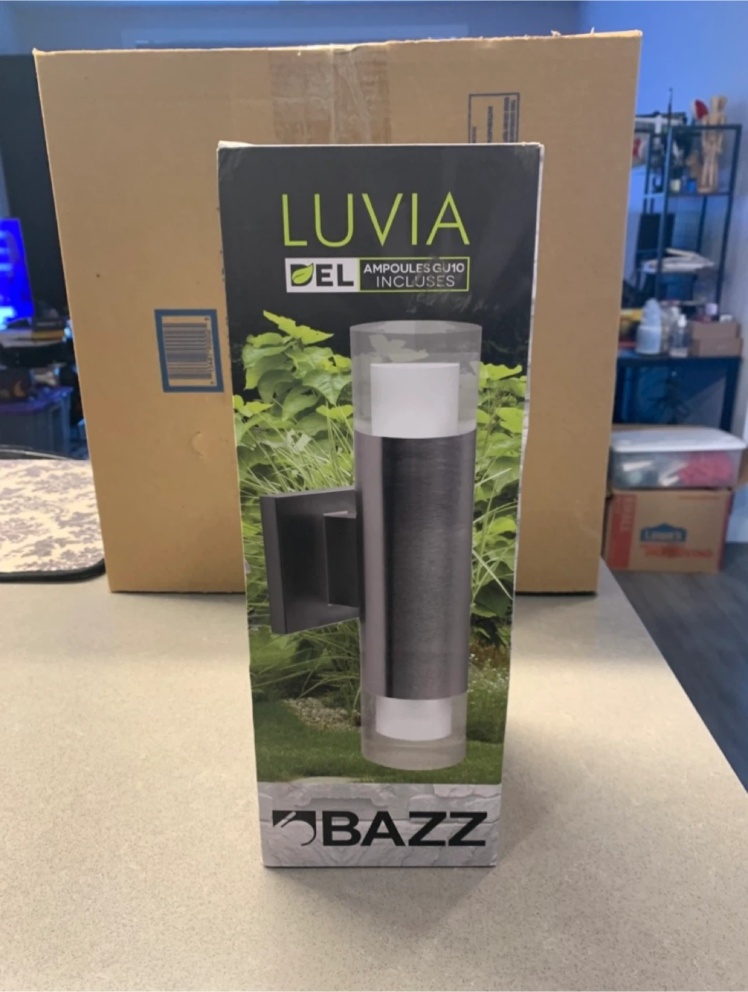This Bazz Luvia outdoor wall light fixture comes with 2 GU10 LED bulbs. It provides 940 lumens of soft white light. The fixture dimensions are 4 1/2” wide and 13 1/4” tall.