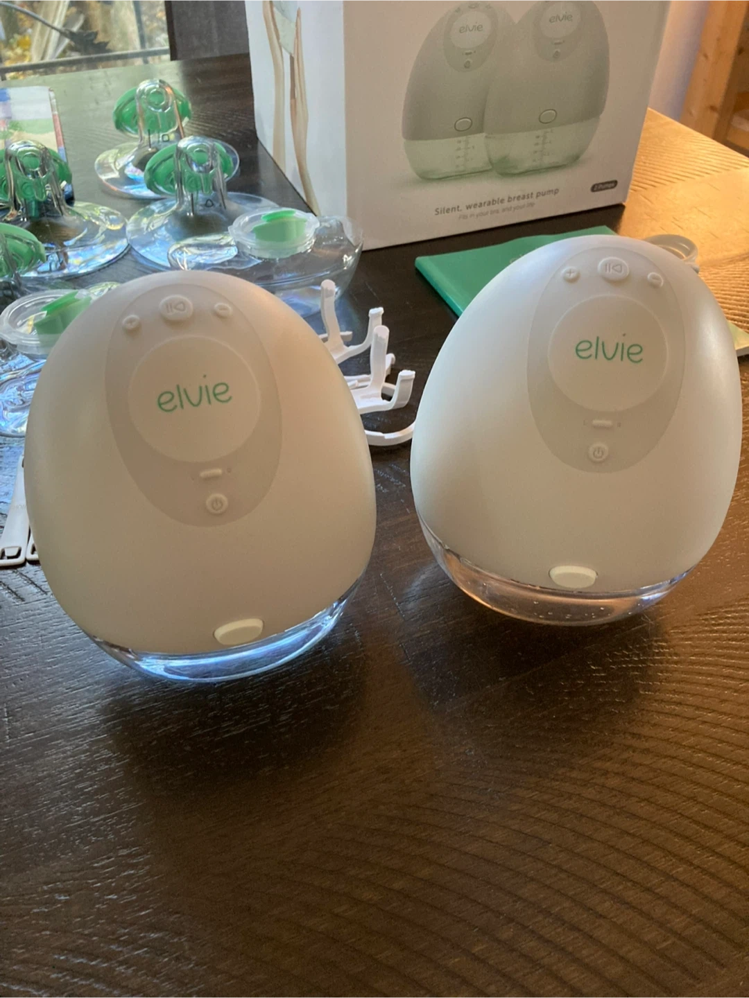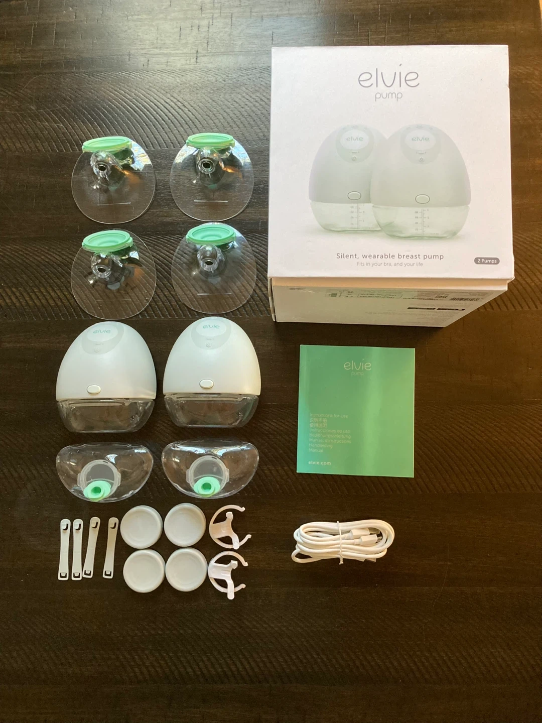 This is a pair of Elvie Pump silent, wearable breast pumps. They're designed to be discreet and worn inside a bra. Includes two pumps, charging cable, and all original accessories. Only used a few times.