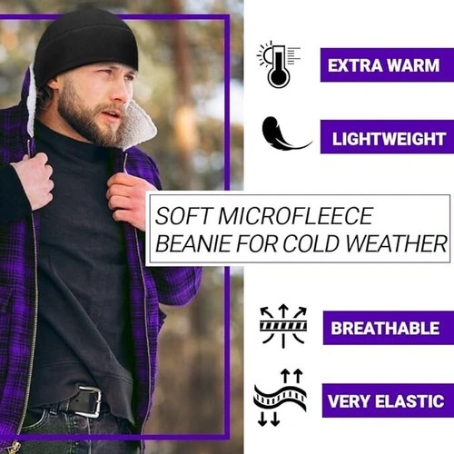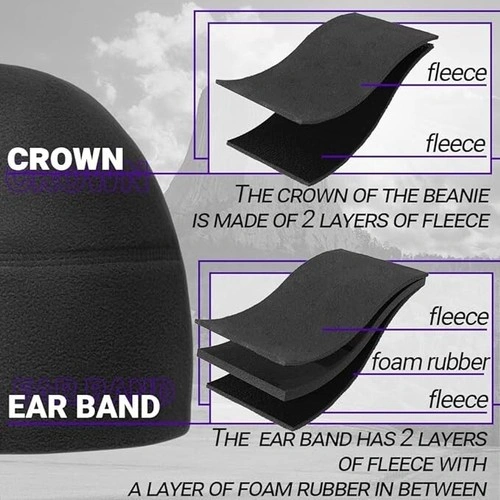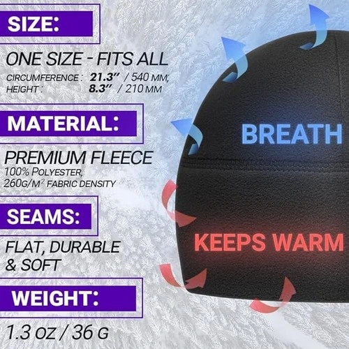 Tactical Fleece Beanie in BLACK. One size fits all. Made from premium quality MICROFLEECE (100% Polyester). It's warm, soft, durable, and water-resistant. The low-profile design is great for winter sports, outdoor activities, tactical gear, or casual daily wear. Can be worn with a helmet. Double-layered fleece for extra warmth and protection for your ears.