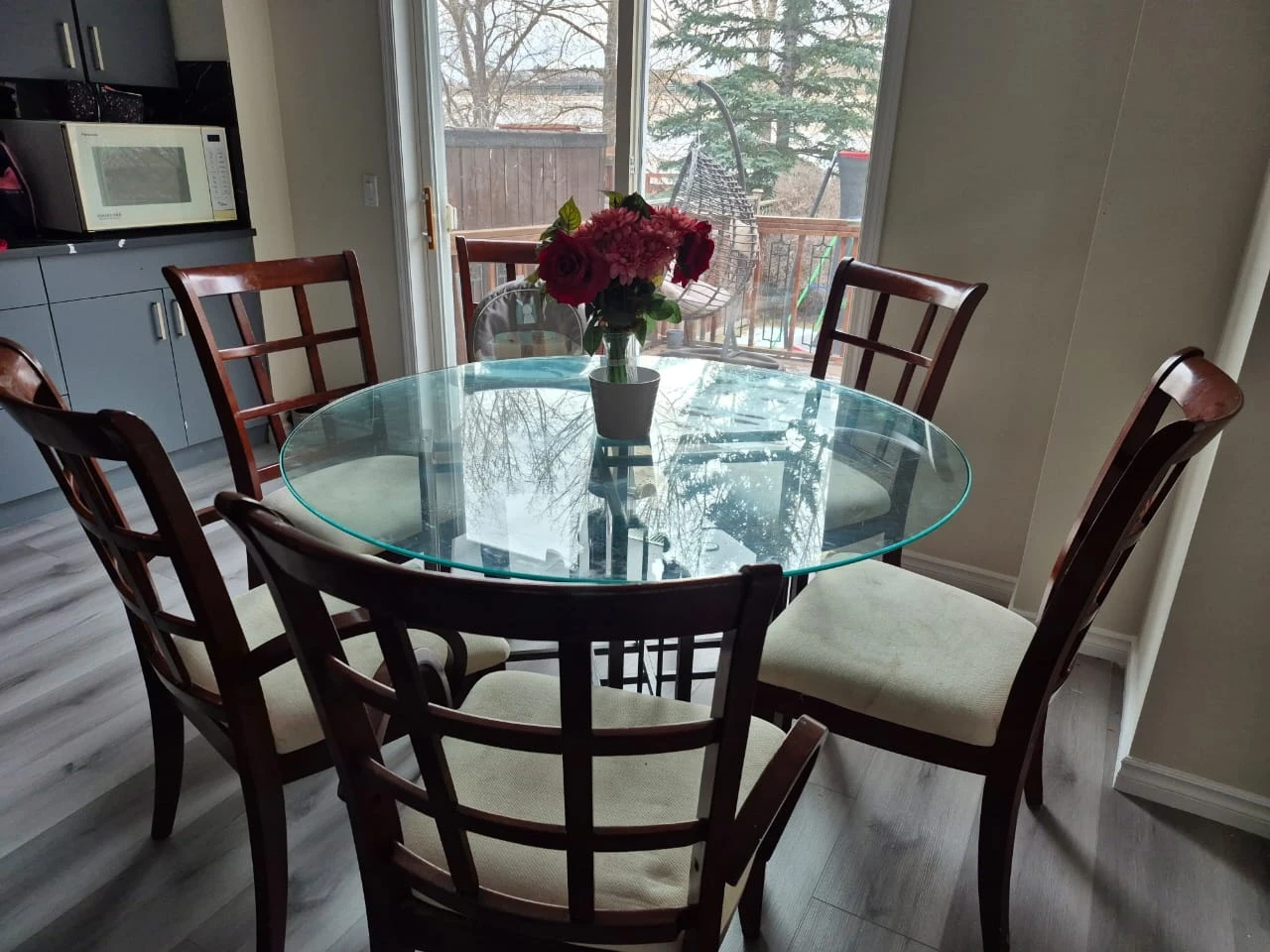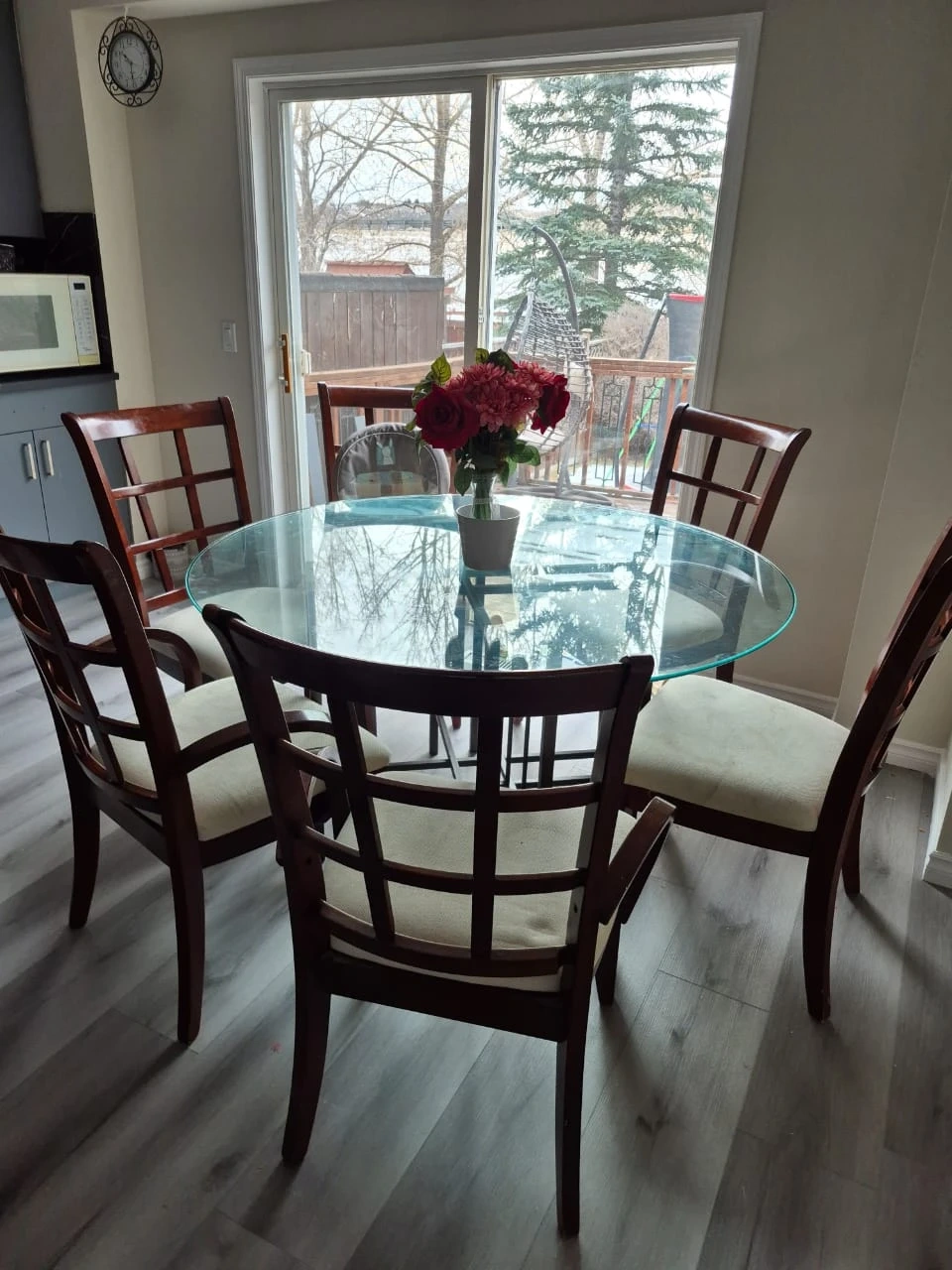 This is a round glass-top dining table that comfortably seats six people. The chairs have dark wood frames with cream coloured cushioned seats. Seats need a good wash.