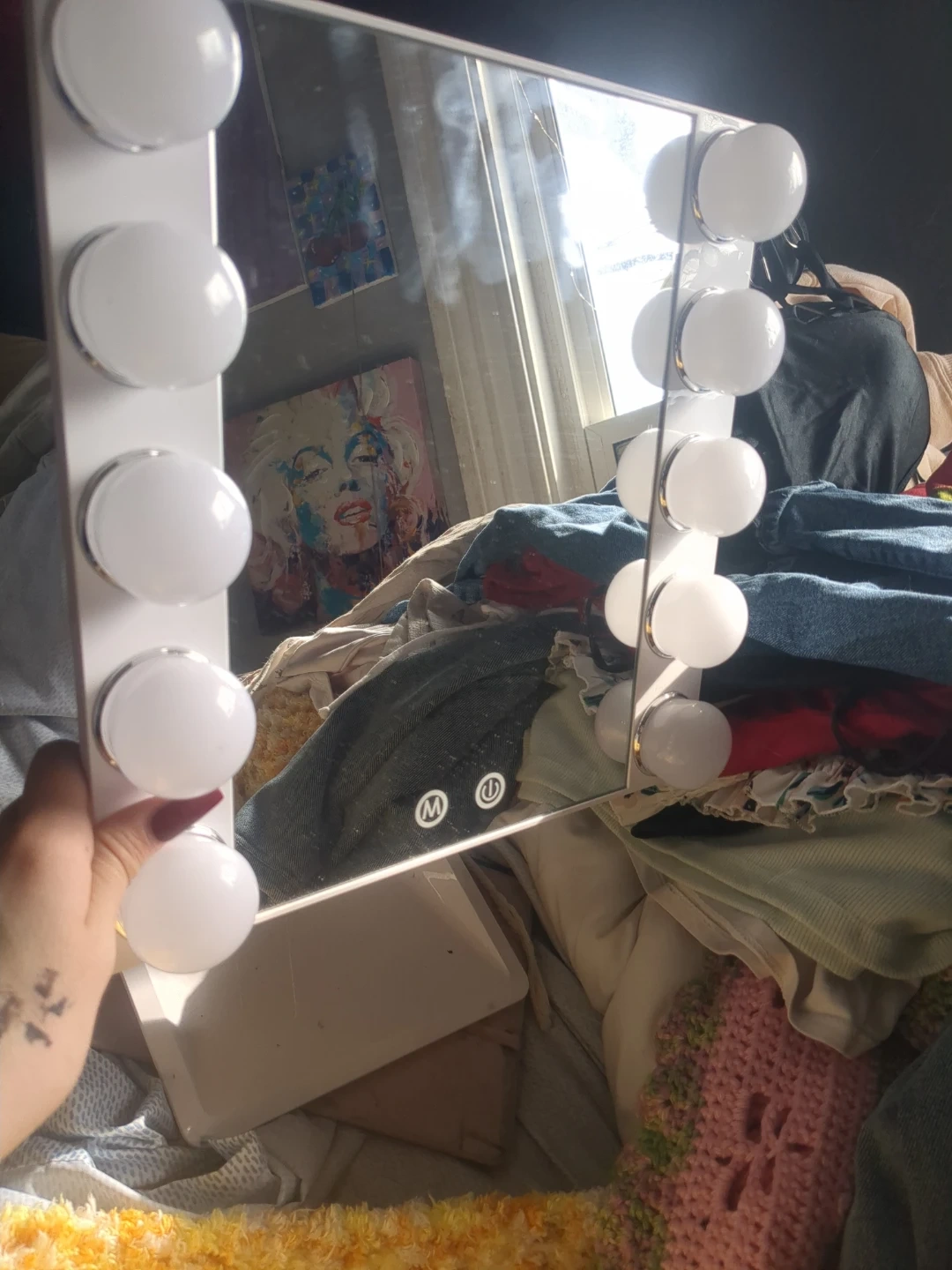 This lighted makeup mirror by Conair features 10 bright LED bulbs around the frame. It has a touch-sensitive control for dimming and on/off functions. Perfect for applying makeup with great lighting!