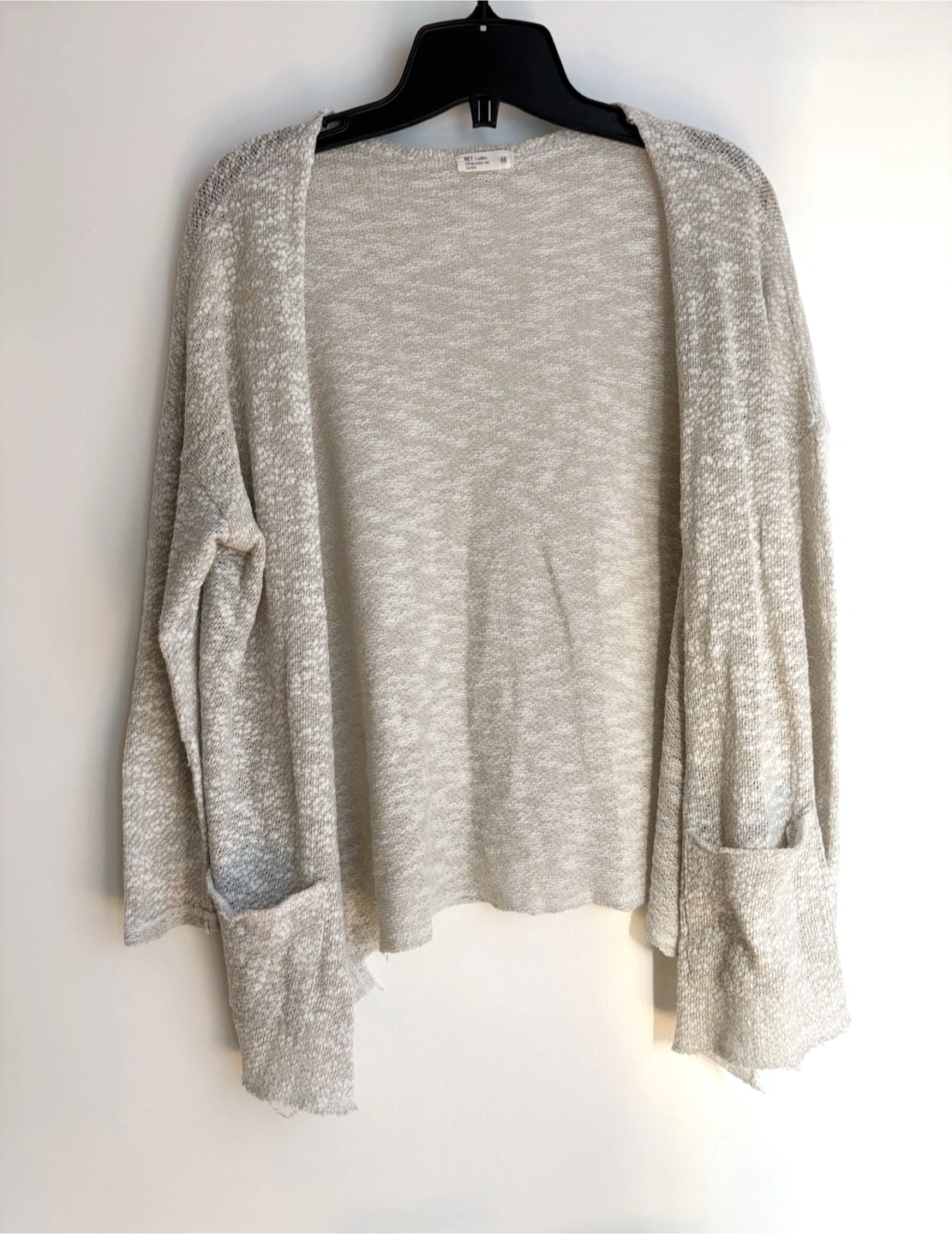 Here's a comfy cardigan! It's a size M but really fits like a small. It has a light, airy feel. Perfect for layering on cooler days or evenings.