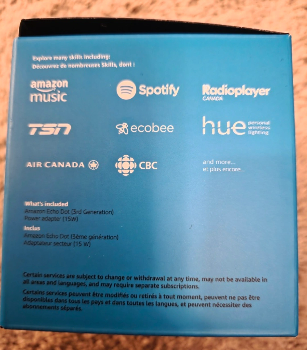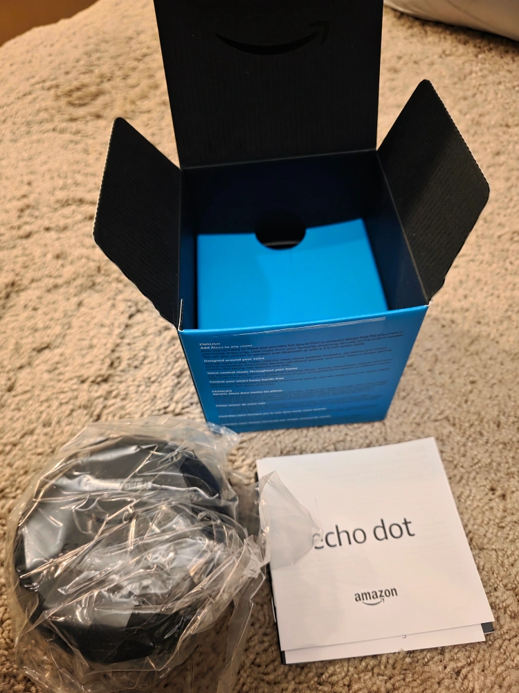This is an Amazon Echo Dot (3rd Generation). It connects to Alexa and provides full sound from a compact design. Includes original box, Echo Dot, and power adapter.