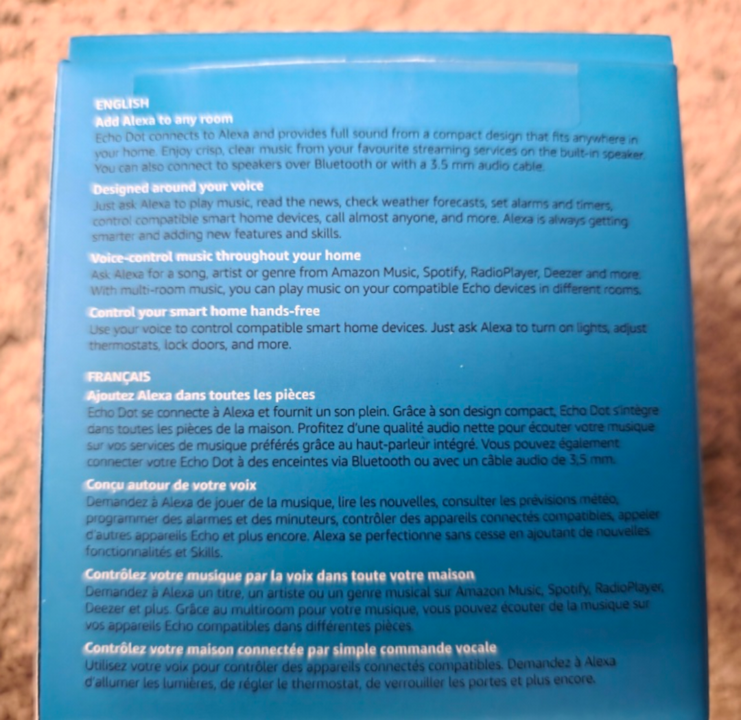 This is an Amazon Echo Dot (3rd Generation). It connects to Alexa and provides full sound from a compact design. Includes original box, Echo Dot, and power adapter.