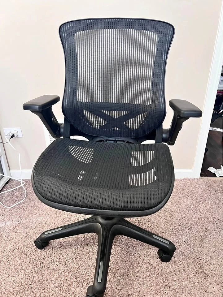 This ergonomic office chair offers great lumbar support and adjustable features for comfortable seating. It's in good condition and perfect for any home office setup.