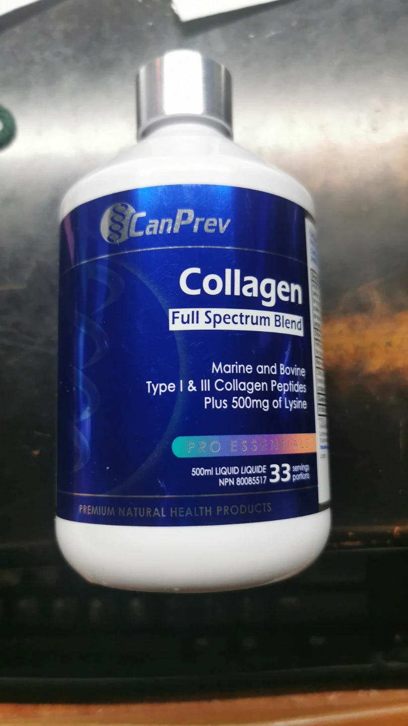 CanPrev Collagen Full Spectrum Blend liquid. Marine and Bovine Type I & III Collagen Peptides. Plus 500mg of Lysine. 500ml bottle, 33 servings. Best before MAY/2028.