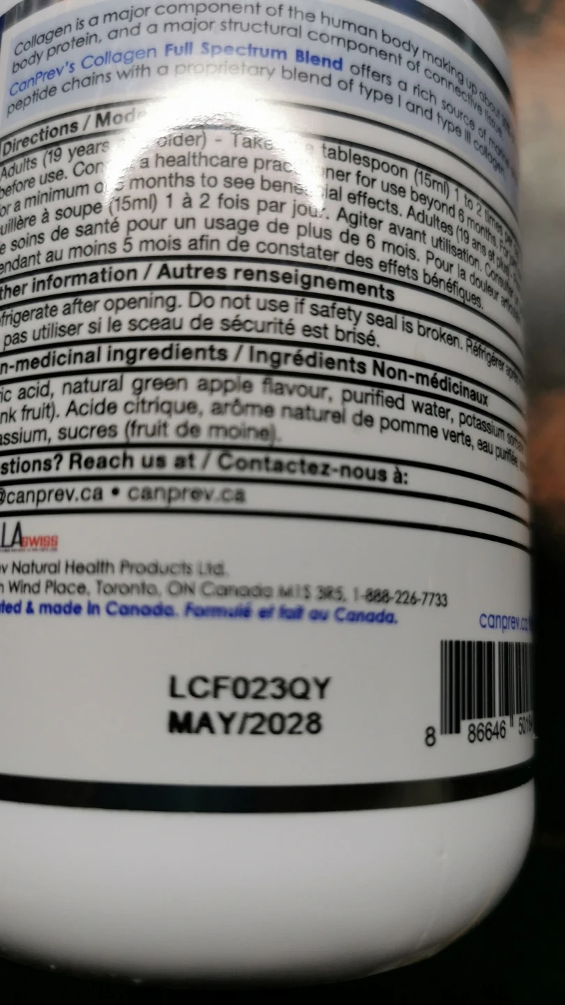 CanPrev Collagen Full Spectrum Blend liquid. Marine and Bovine Type I & III Collagen Peptides. Plus 500mg of Lysine. 500ml bottle, 33 servings. Best before MAY/2028.