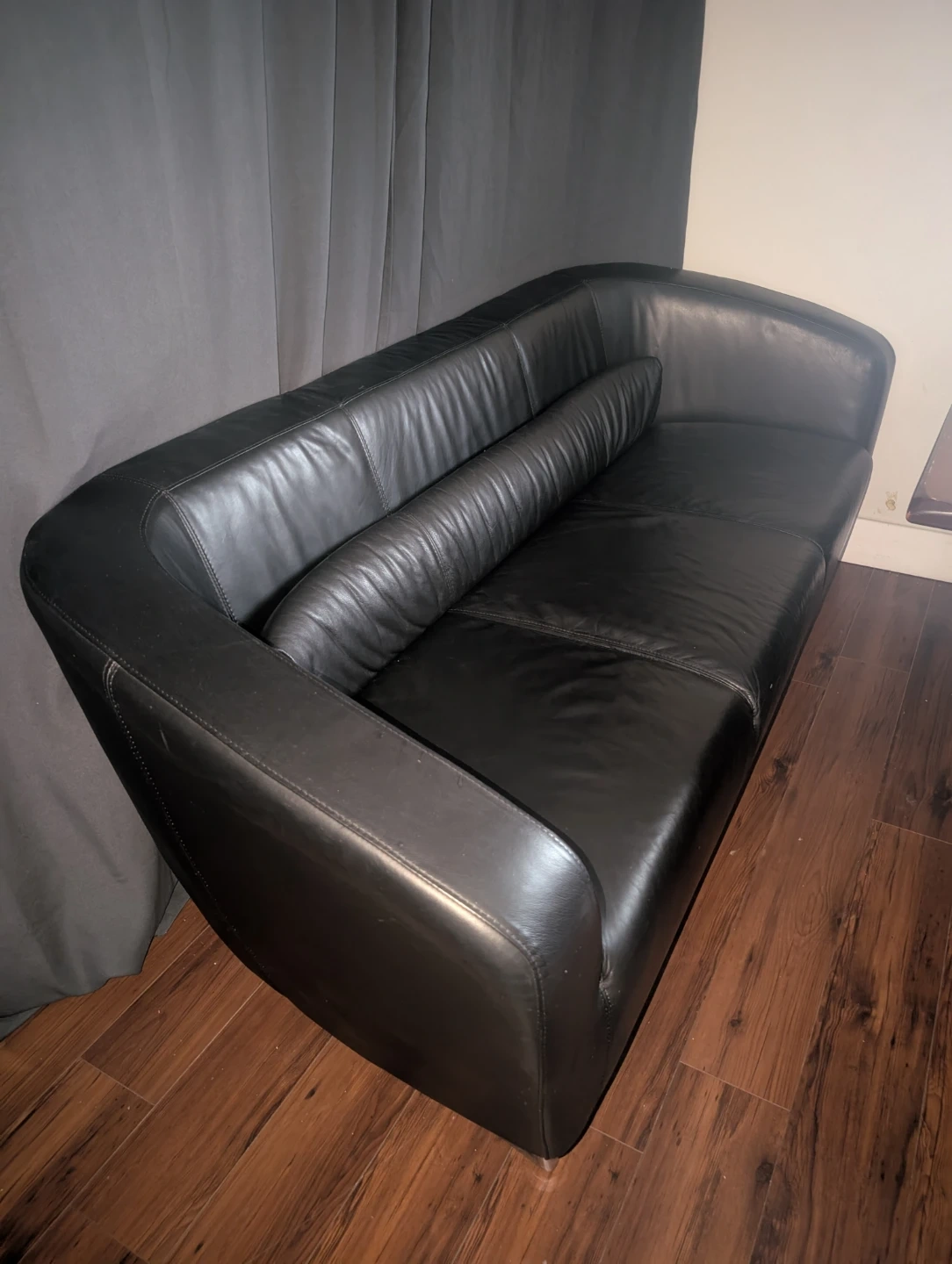 Selling a sleek black leather sofa. It's in good condition and would look great in any living room or den. The sofa features a modern design with a comfortable back cushion. It has a minimalist look with silver legs.