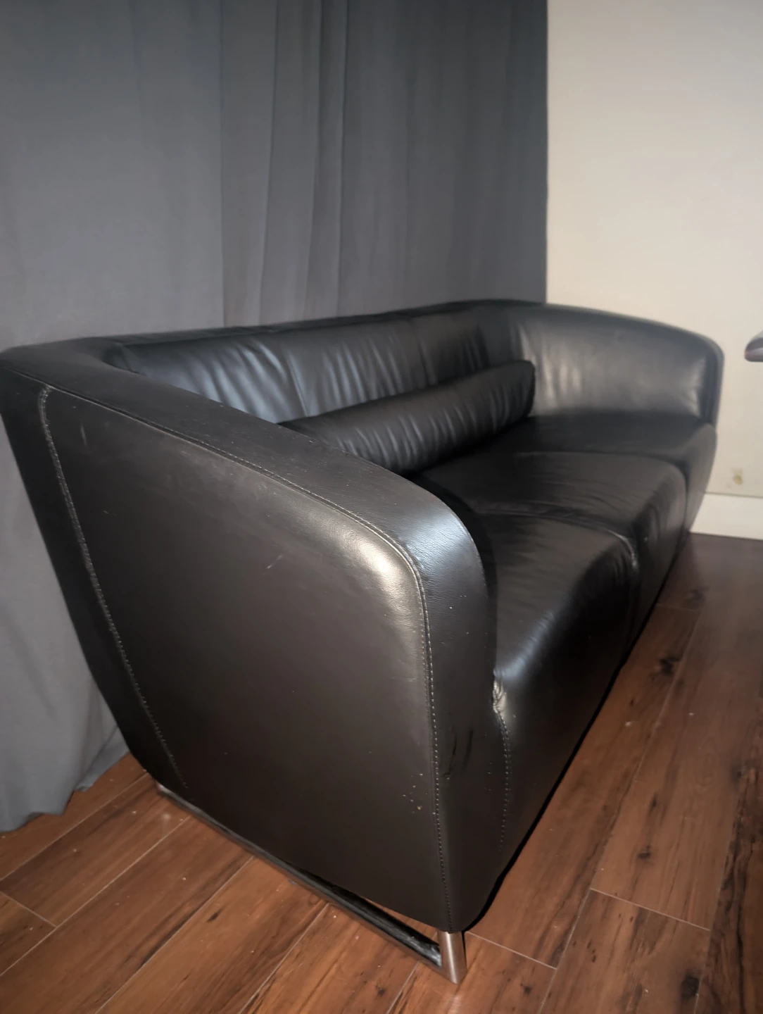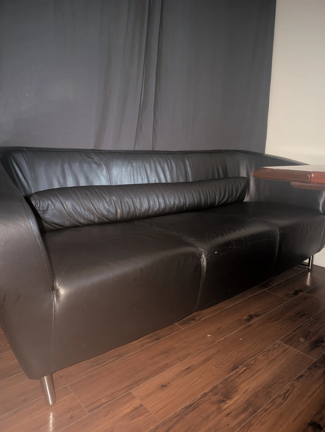Selling a sleek black leather sofa. It's in good condition and would look great in any living room or den. The sofa features a modern design with a comfortable back cushion. It has a minimalist look with silver legs.