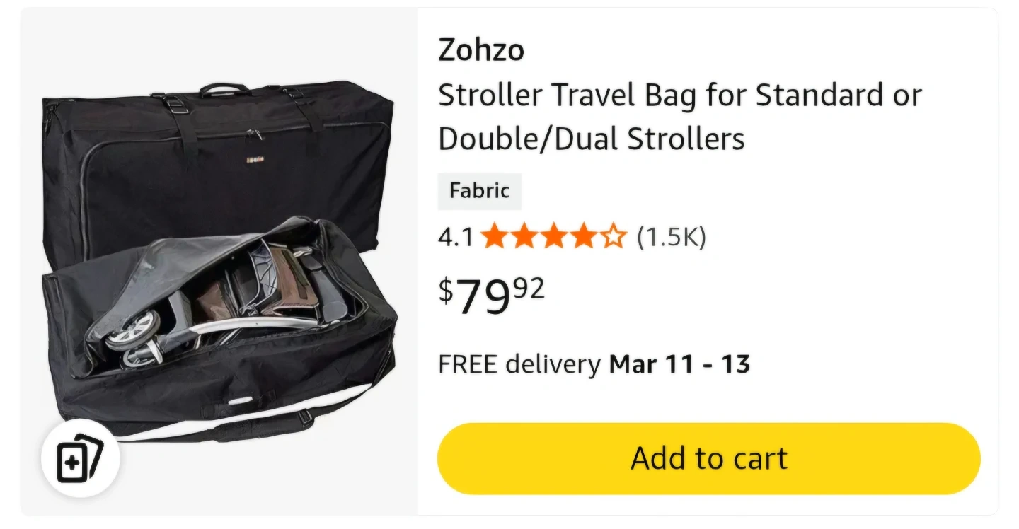 This Zohzo travel bag is designed for standard or double/dual strollers. It's made of fabric and includes a handle and straps for easy carrying. Dimensions are 41 x 21 x 13.5 inches.