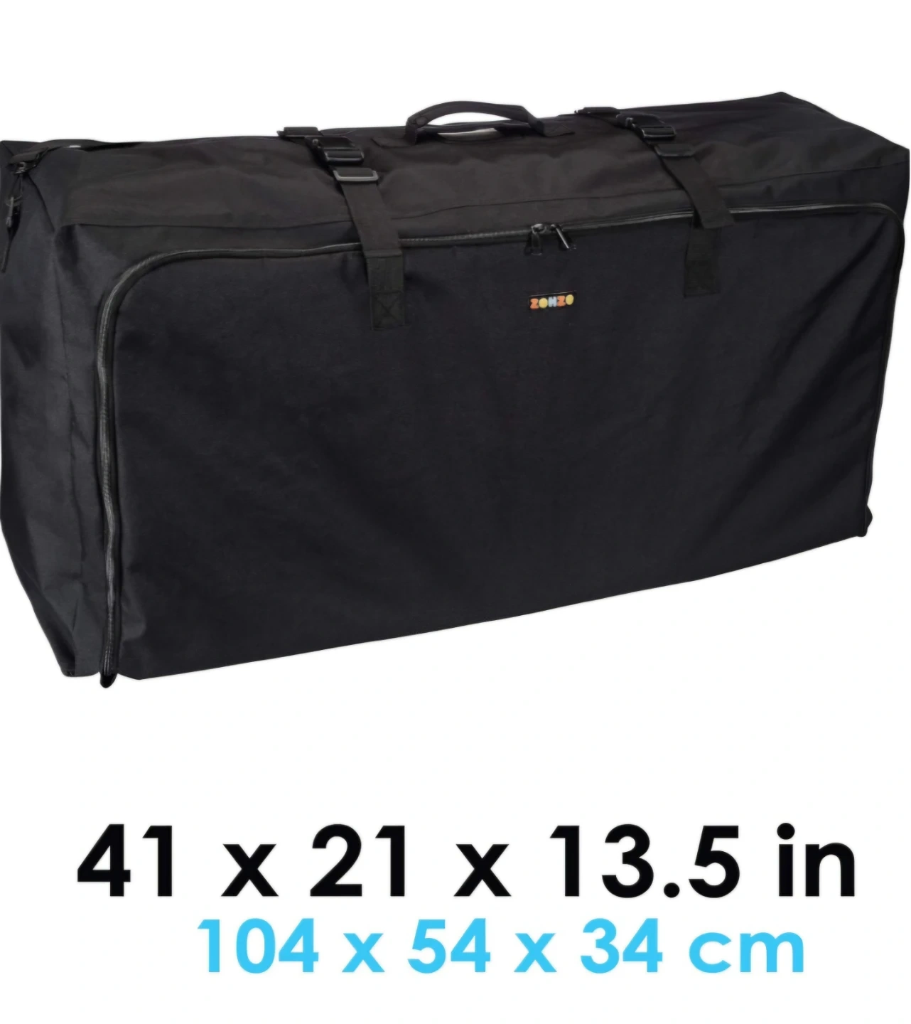 This Zohzo travel bag is designed for standard or double/dual strollers. It's made of fabric and includes a handle and straps for easy carrying. Dimensions are 41 x 21 x 13.5 inches.