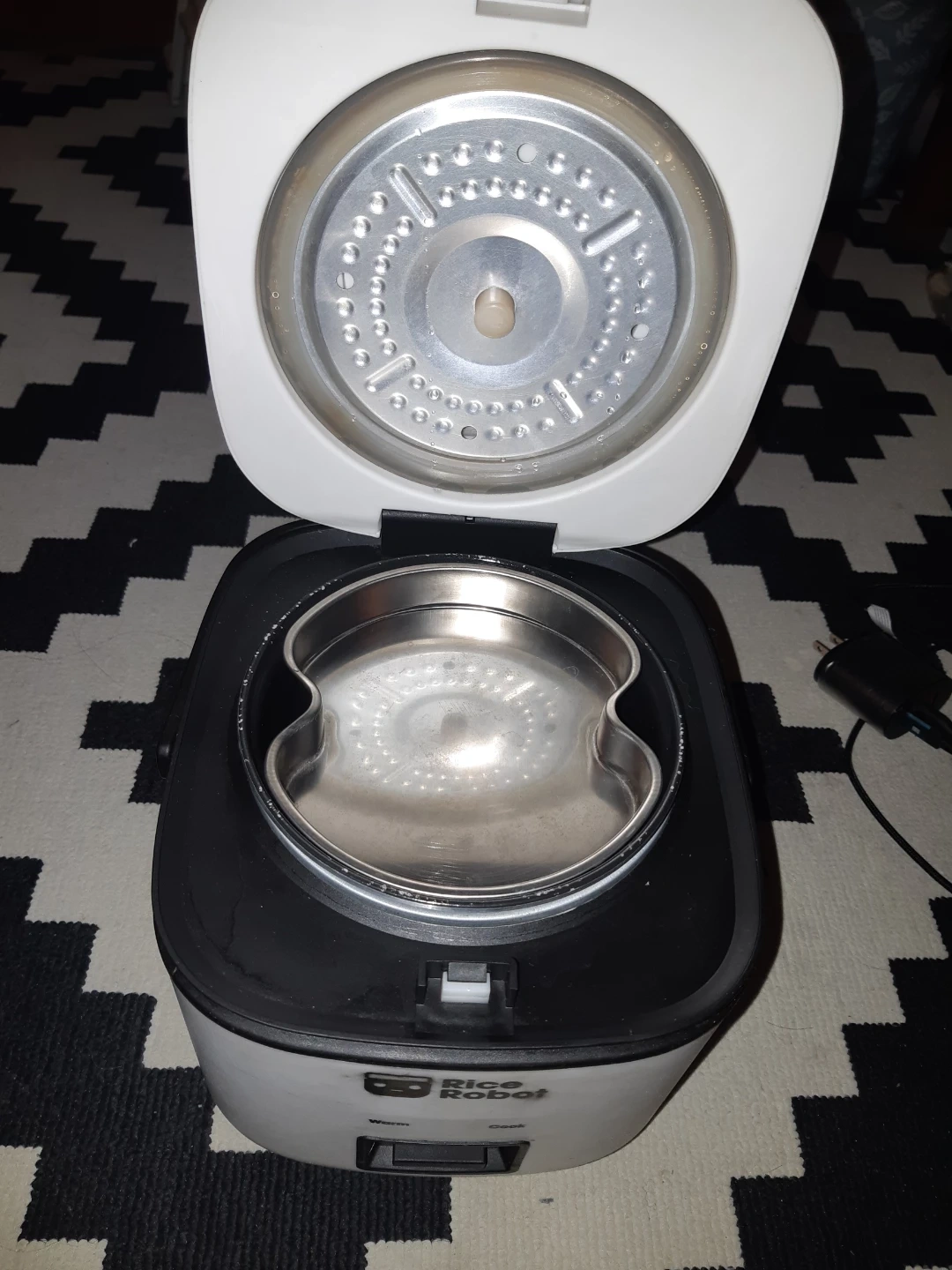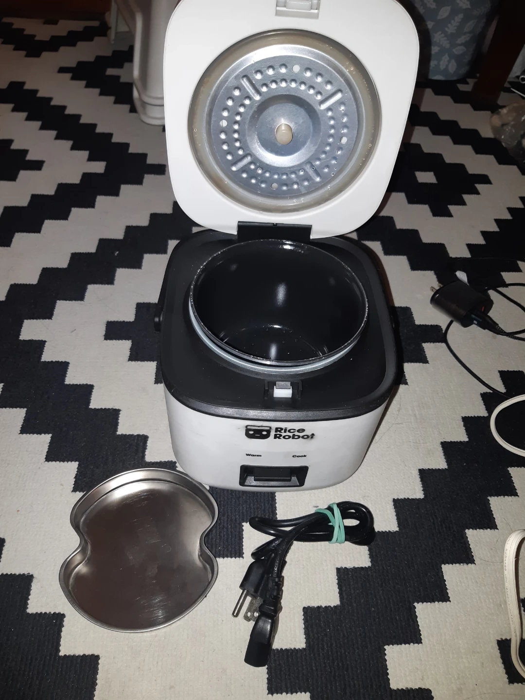 Compact white Rice Robot mini rice cooker. It has 'Warm' and 'Cook' settings. This appliance is great for making small batches of rice for one or two people.