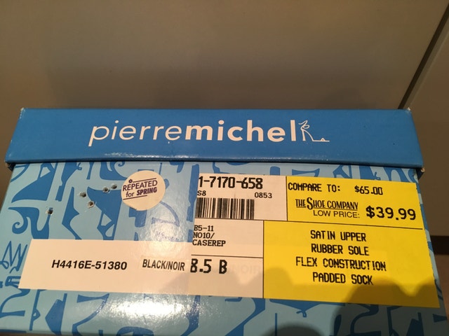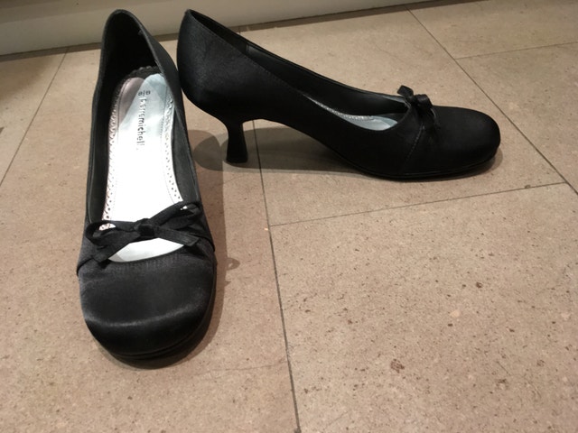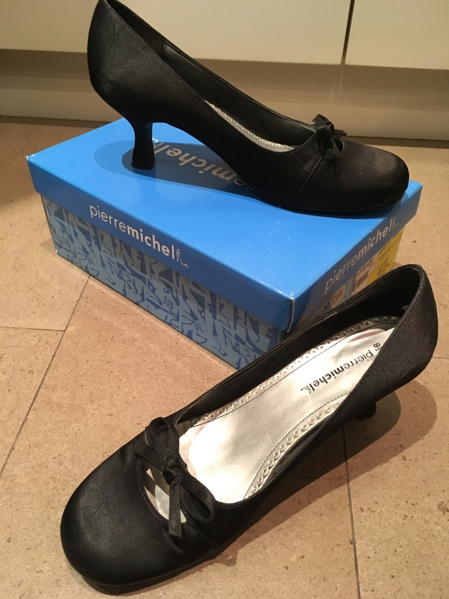 Selling a pair of Pierre Michel Black Satin shoes pumps with cute black satin bows and a cute comfortable heel. Size 8.5. These were used only a couple of times (literally - check out pic of heel to see that it's not worn down at all). Really cute and comfy. Asking $25. Available for pick up in the Broadview/Danforth area. Contact-free porch pick up. Check out my other great stuff!