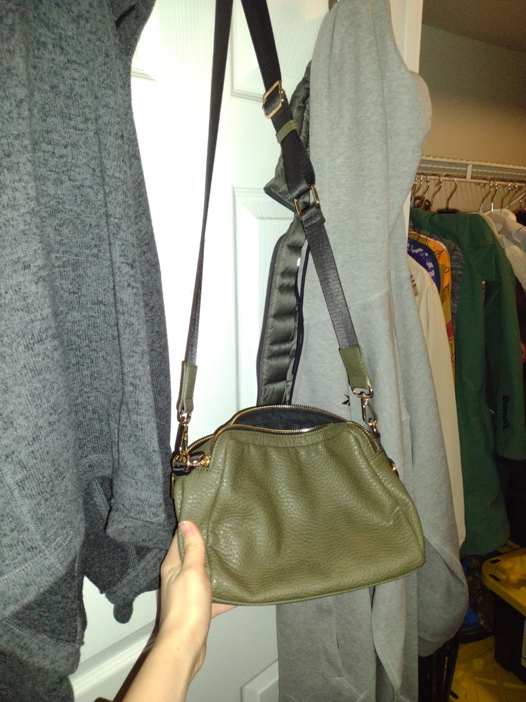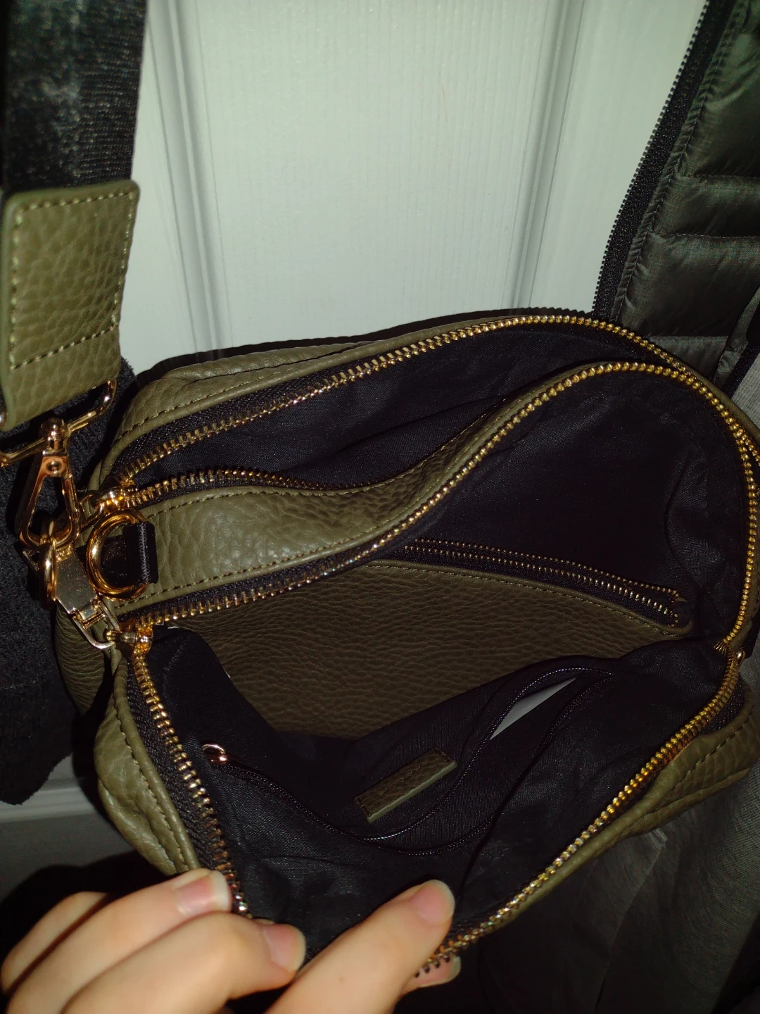 This olive green purse has a textured finish and a zip closure. It features multiple compartments inside for organization. Adjustable crossbody strap included.