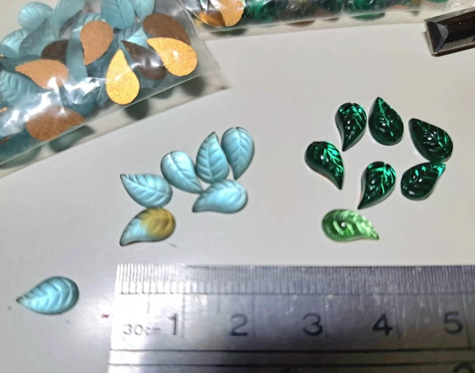Vintage crystal leaf shapes to glue or press to clay. 'Hemetite' finish on pressed glass good quality. Pressed glass- deep amythest colour good cut, 7-8mm size for settings or clay.