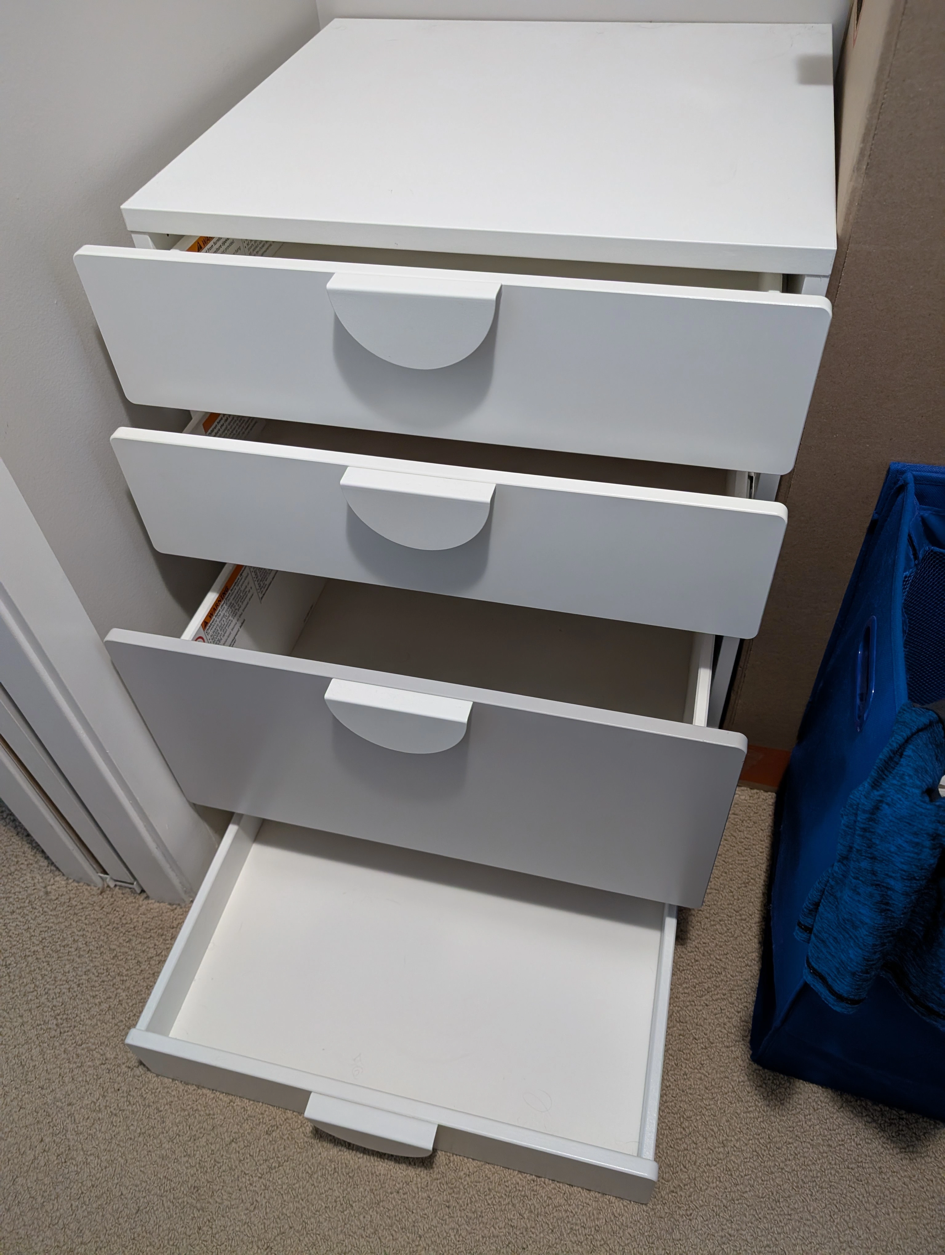 The front of one drawer is grey. Everything else is white. Optional handles have already been installed.