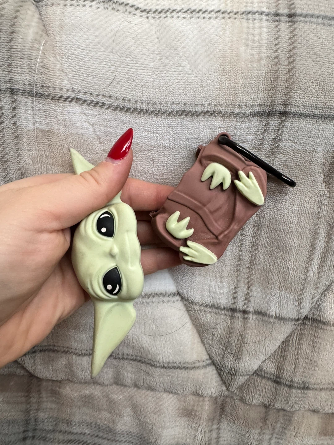 This is a cute Grogu AirPods case. It's made of a soft silicone-like material and has a clip for easy carrying. Protect your AirPods in Star Wars style!