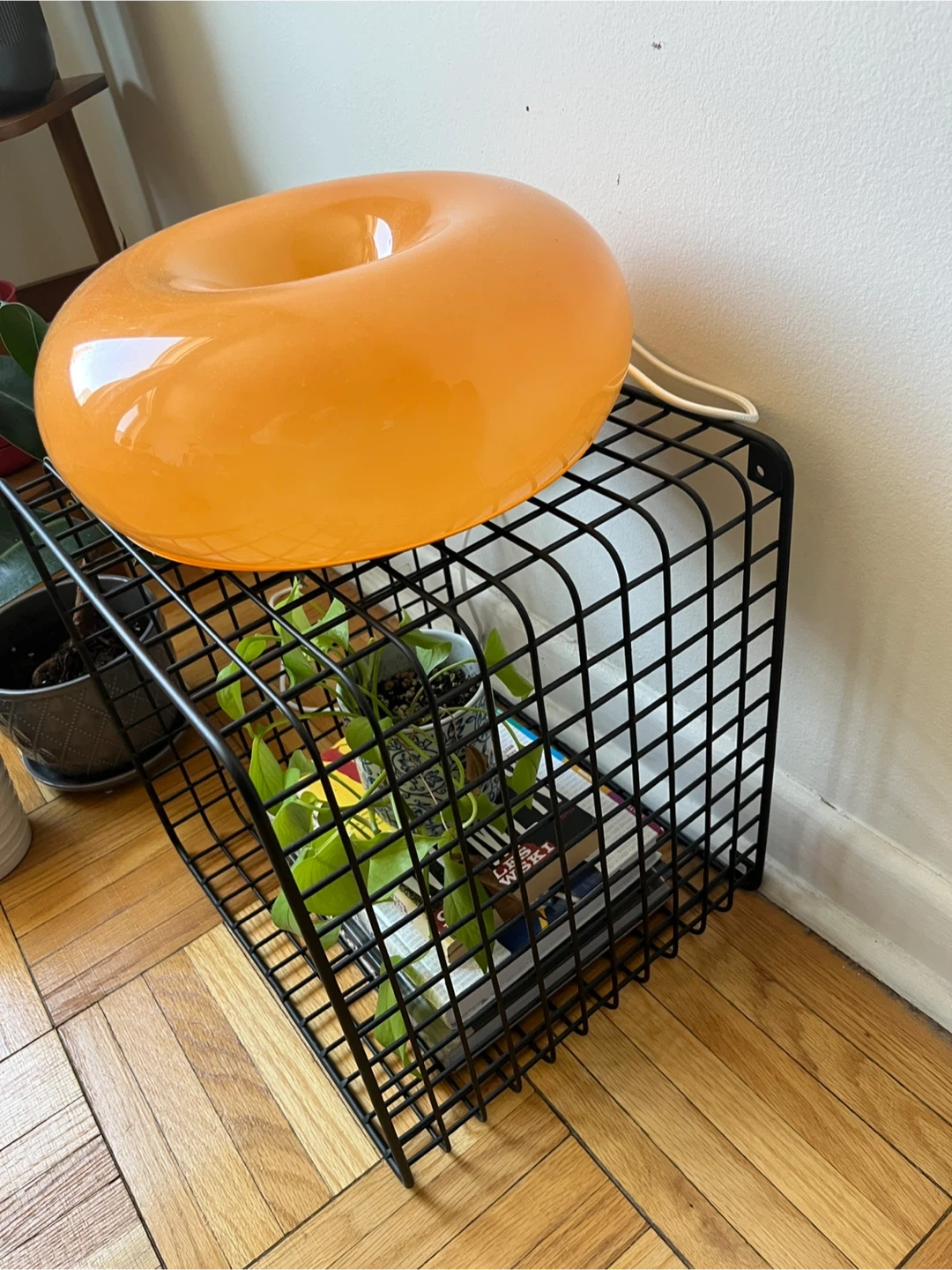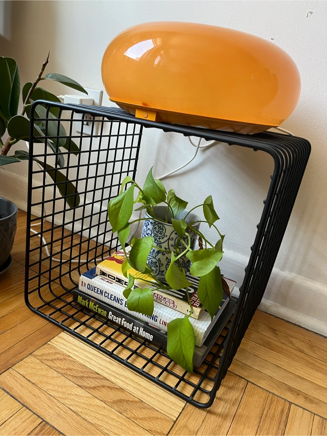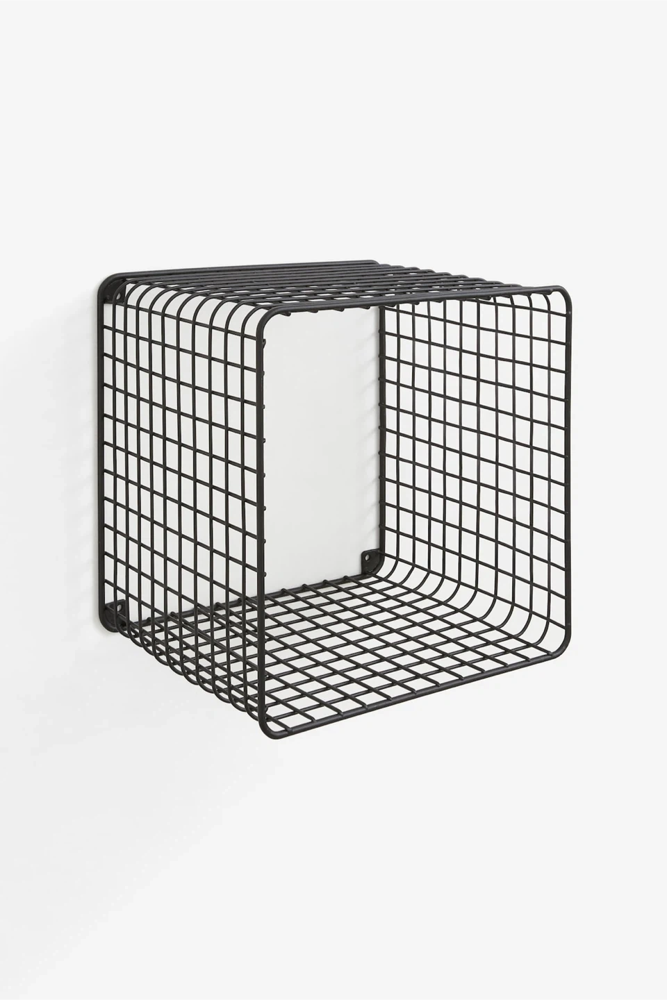 Wall shelf in metal wire for organizing and displaying everyday and decorative objects. Discreet mounting with screw holes at back. Depth 12 in. Width 14 x 14 in.