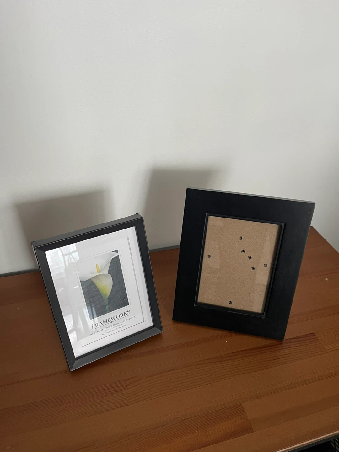 Two black photo frames from Frameworks. One frame has a white matting and an insert with a floral image. The other frame is ready for your own photos. Fits standard photo sizes.