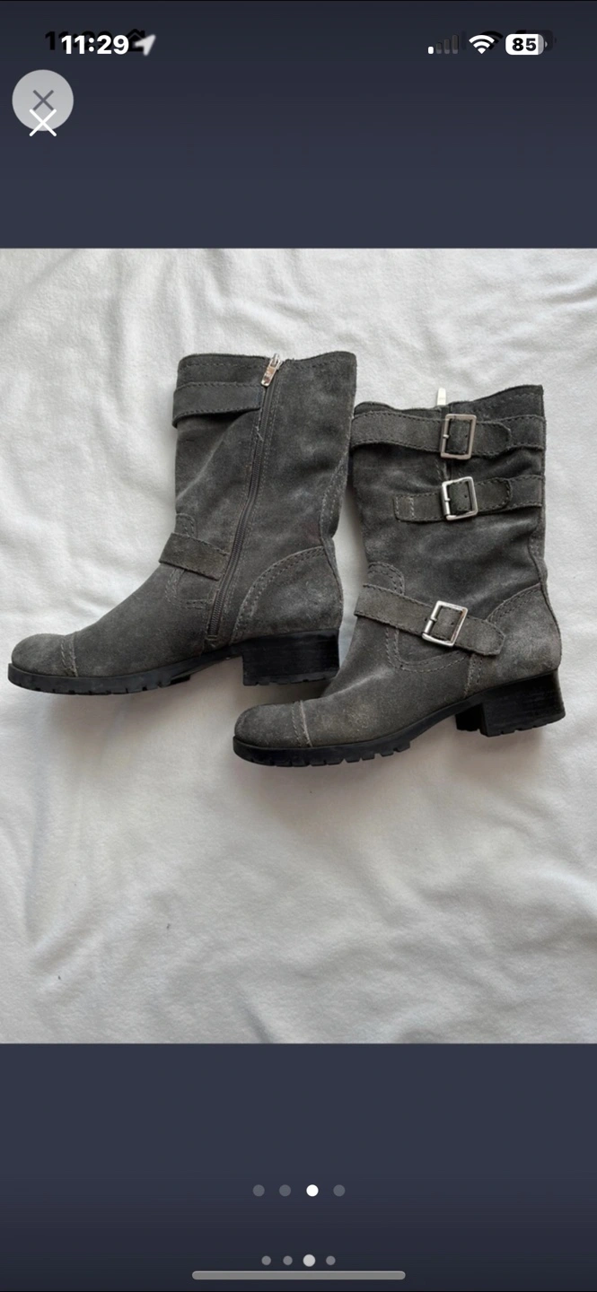 Gray suede mid-calf boots. Features double buckles and zippers. Low block heel like new condition