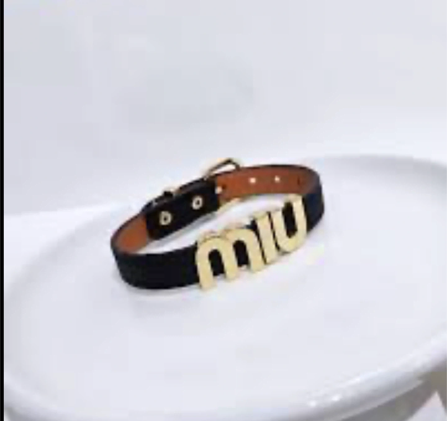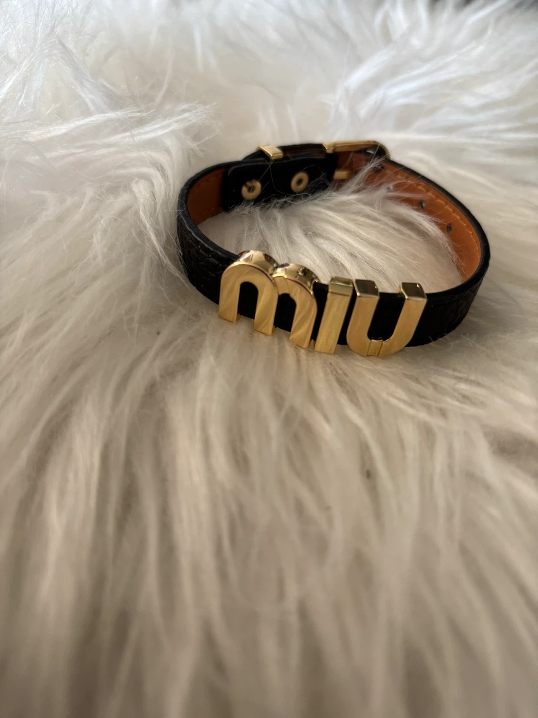 Selling a Miu Miu bracelet in great condition! It features a black leather strap with gold-toned Miu Miu lettering. It's a stylish accessory to elevate any outfit