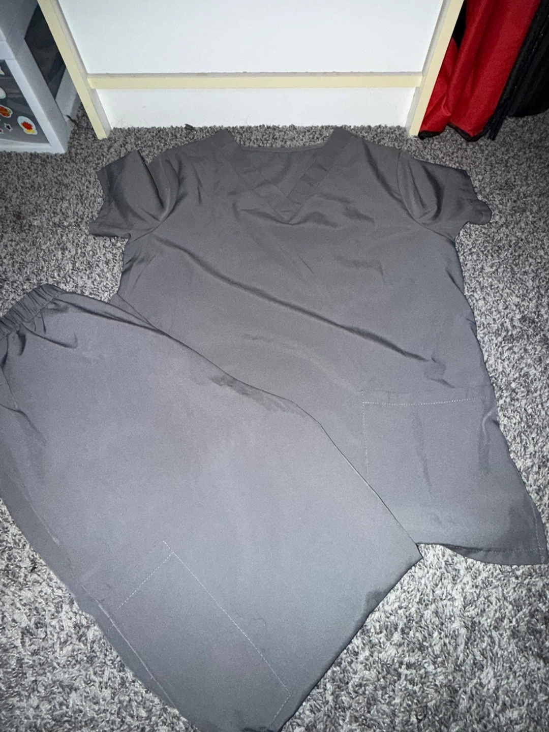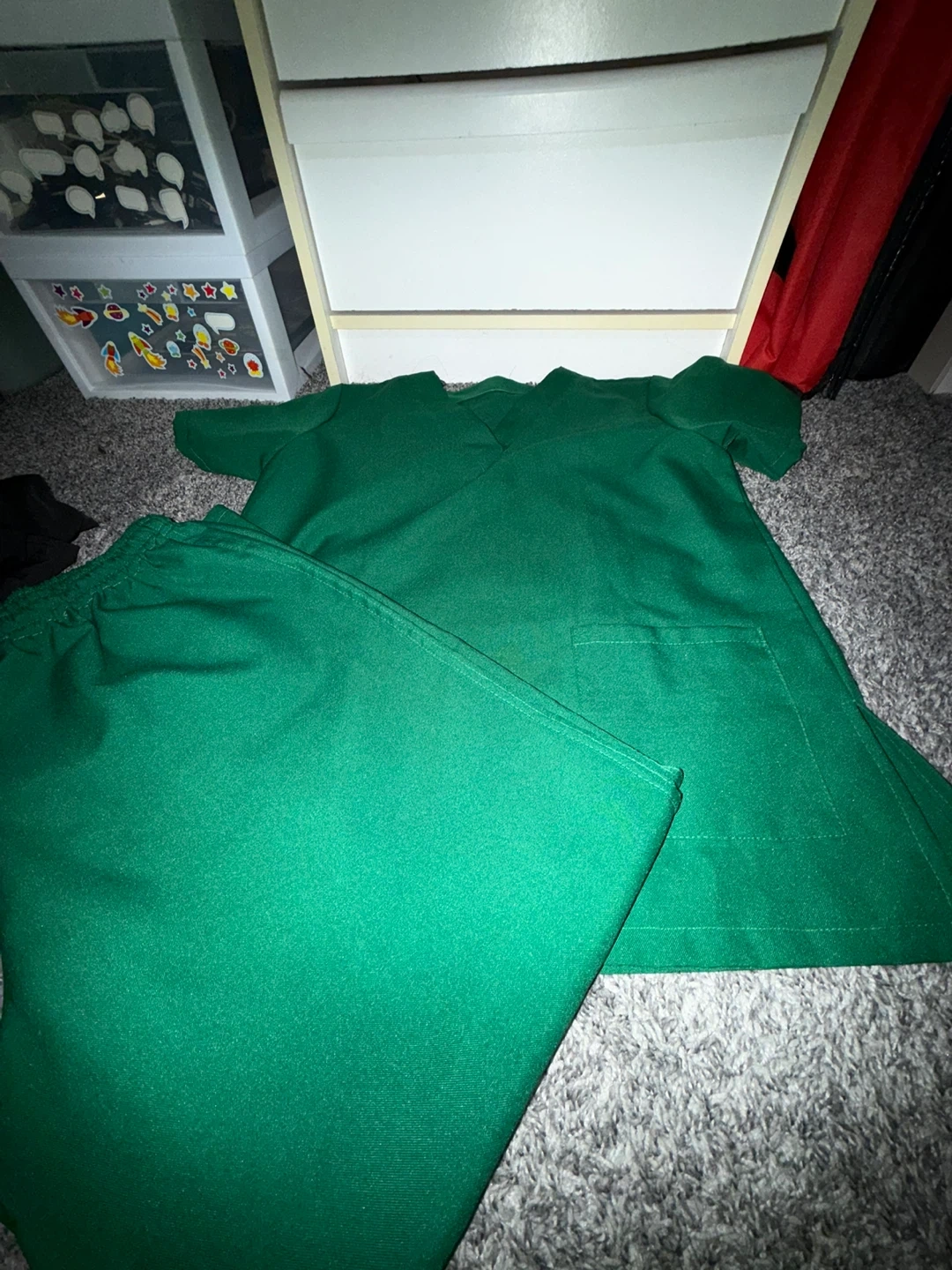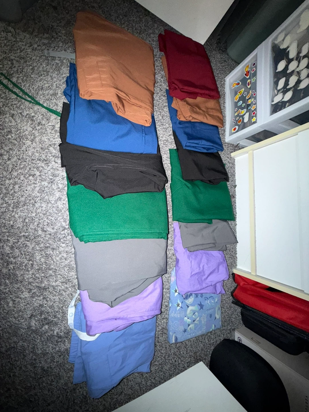 Multiple sets of scrub tops and bottoms in various colours. These are comfortable and durable for everyday wear. Available in black, red, green, orange, and purple.