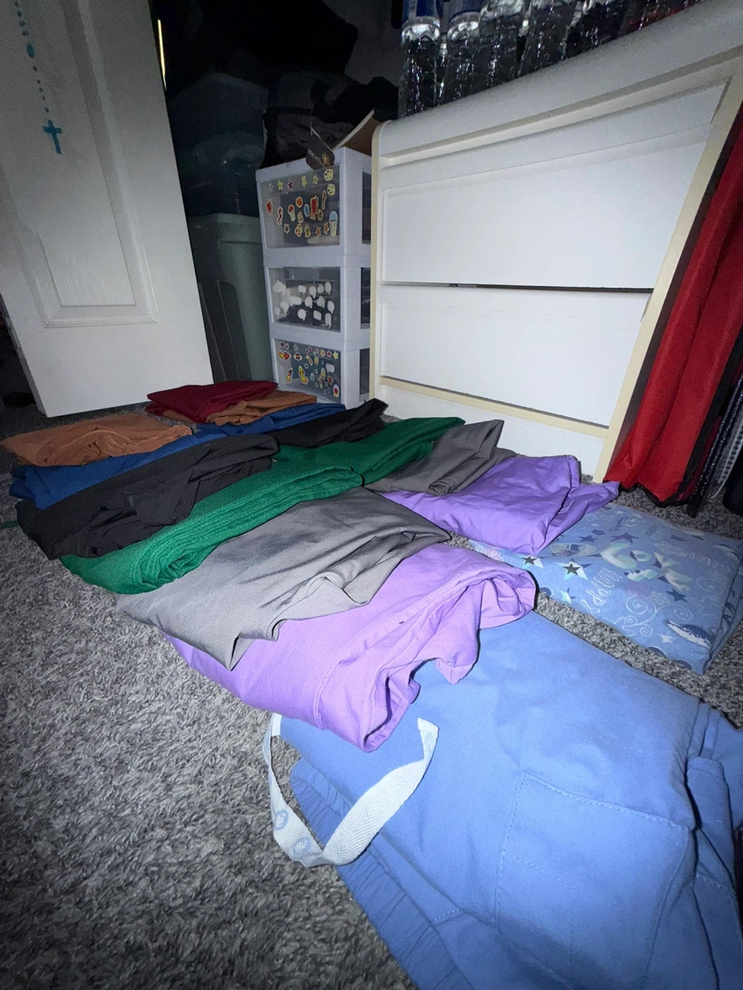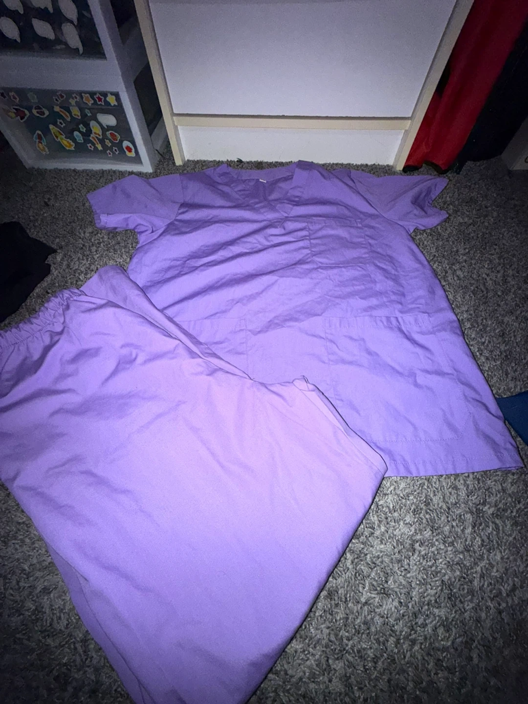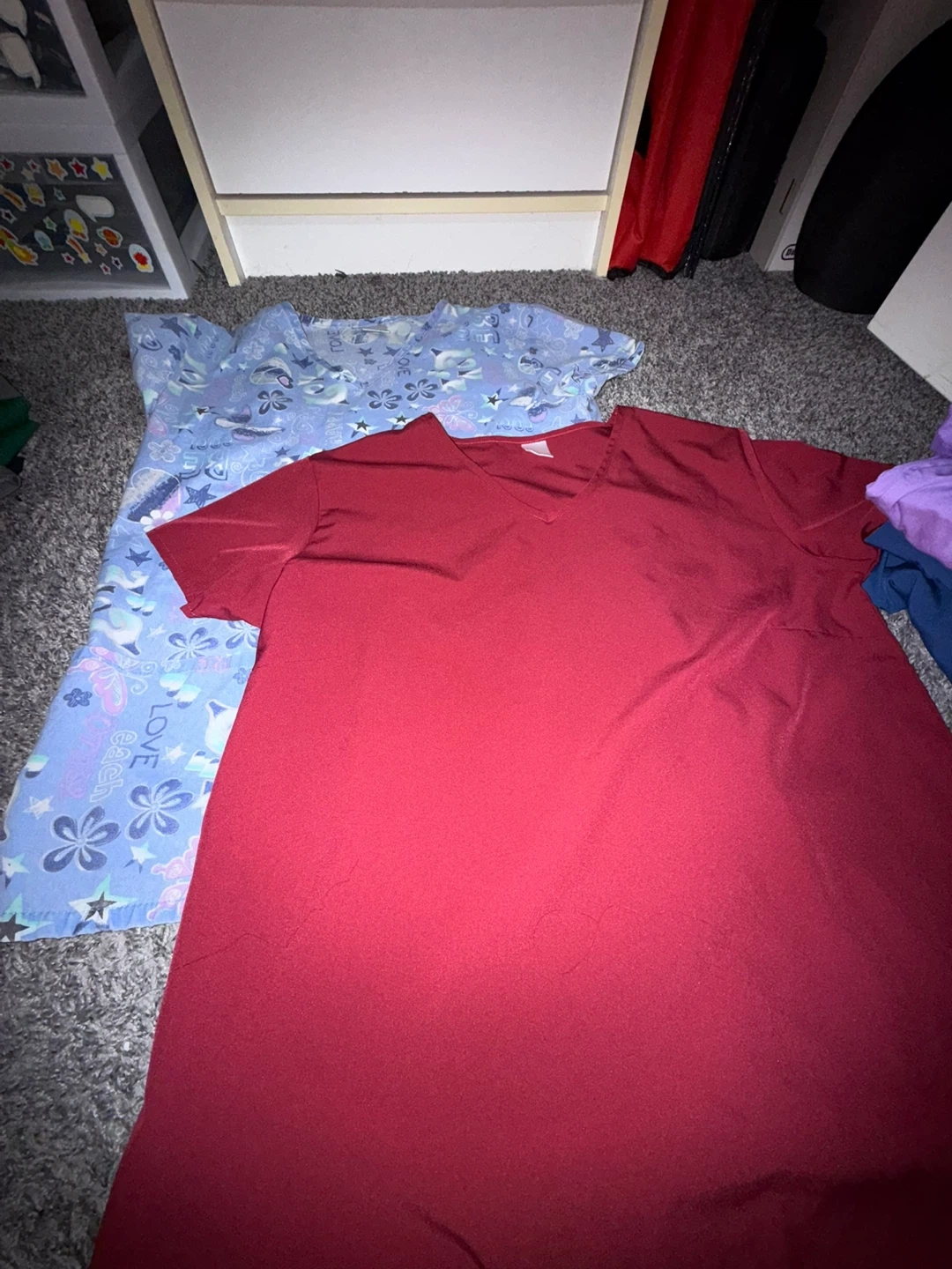 Multiple sets of scrub tops and bottoms in various colours. These are comfortable and durable for everyday wear. Available in black, red, green, orange, and purple.