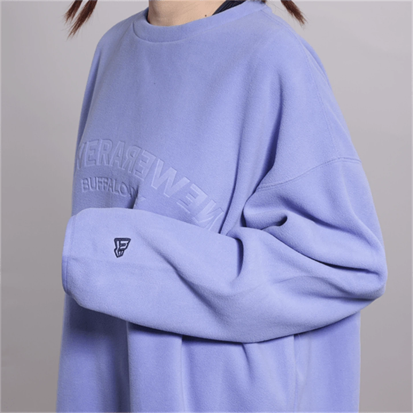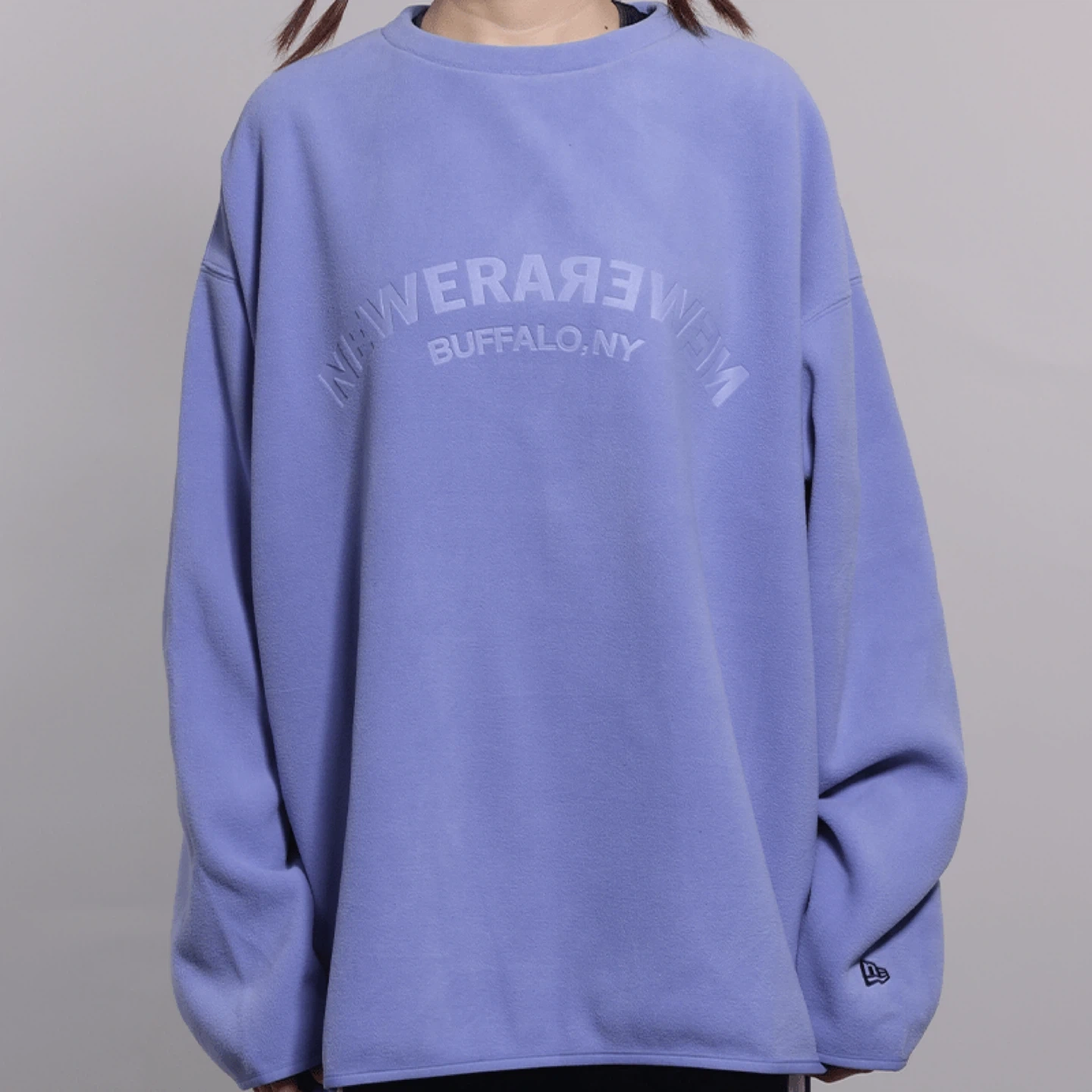 A comfortable New Era crewneck sweatshirt in a lovely shade of purple. It features embossed lettering that reads "NEW ERA BUFFALO, NY". Made with soft material for all-day wear. This sweatshirt is perfect for cooler weather.
