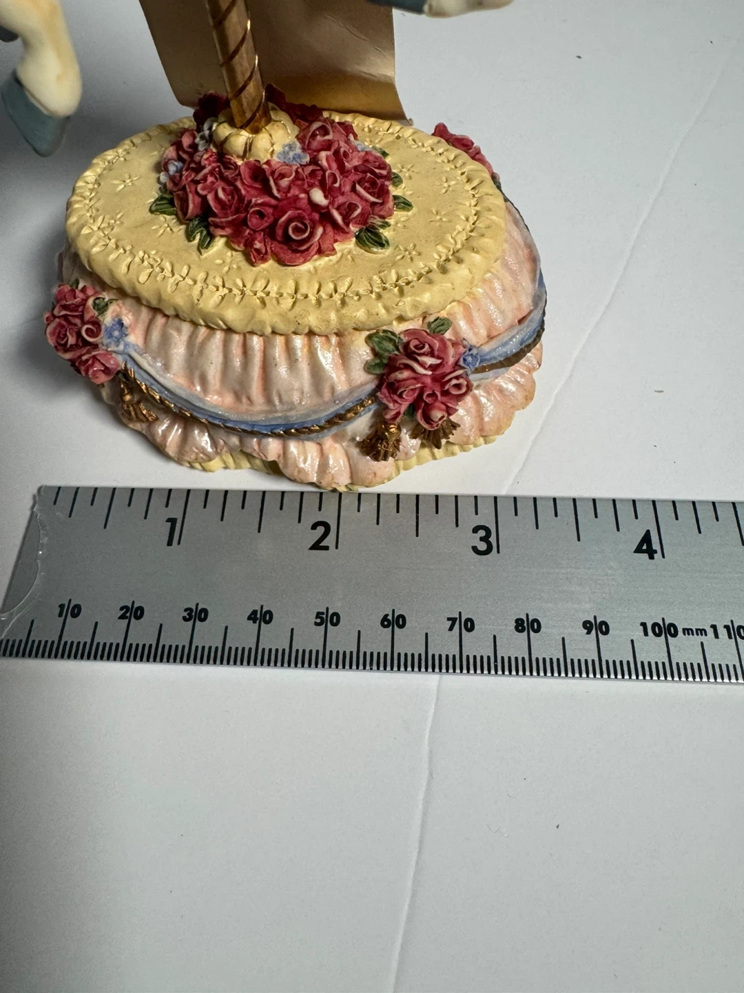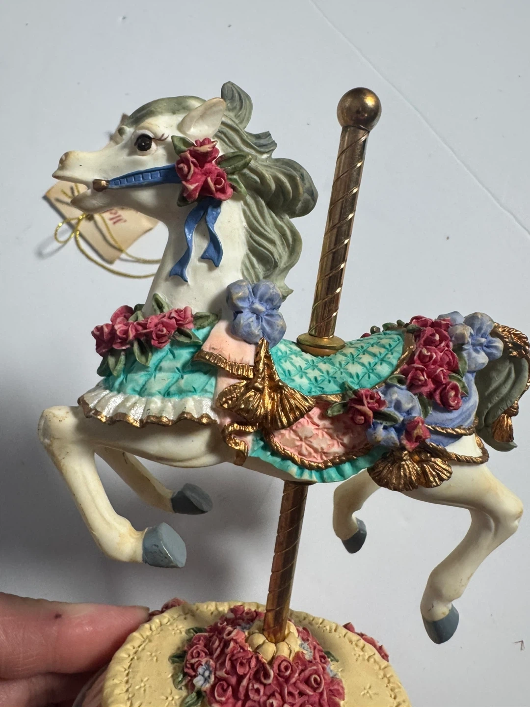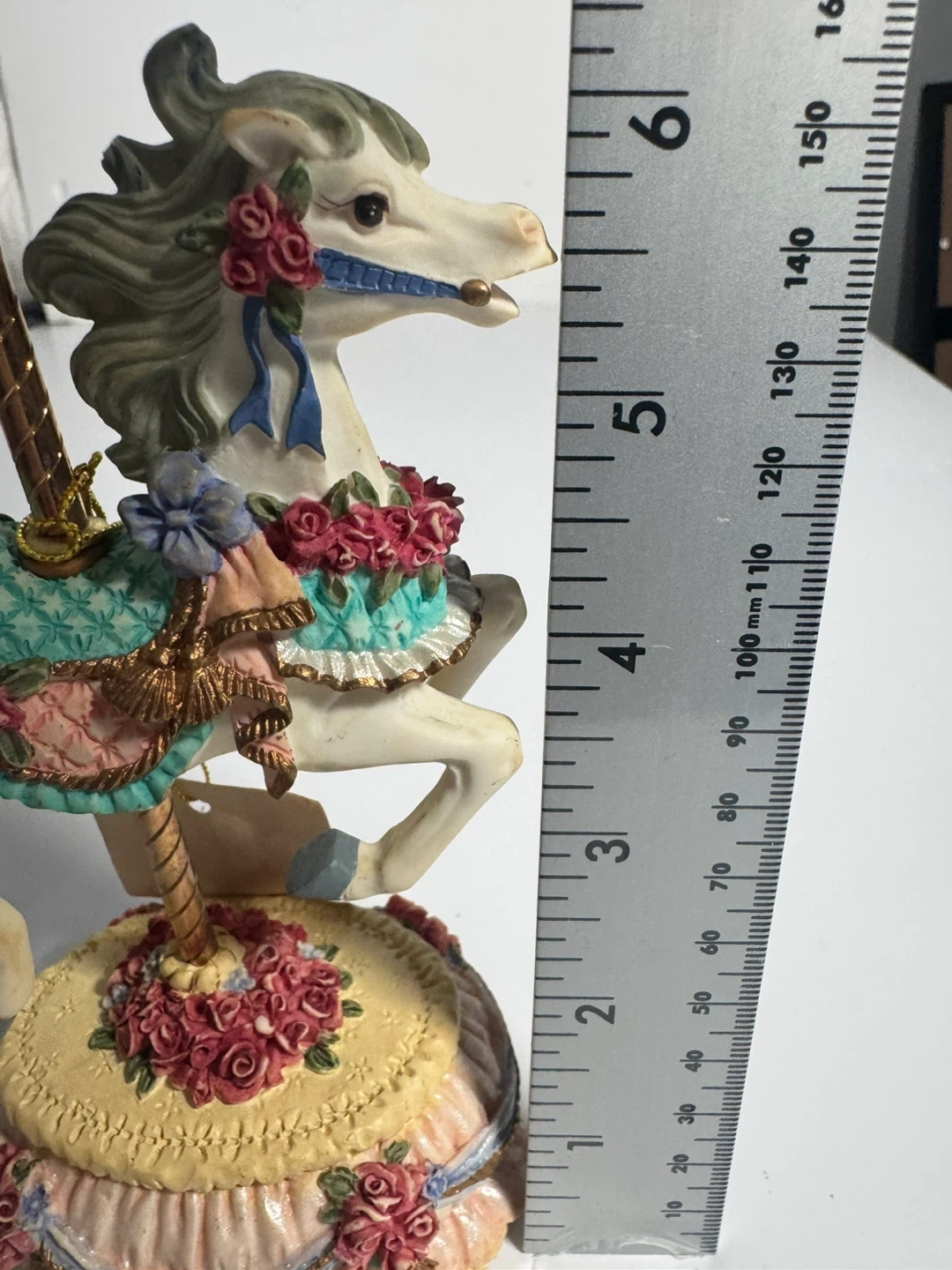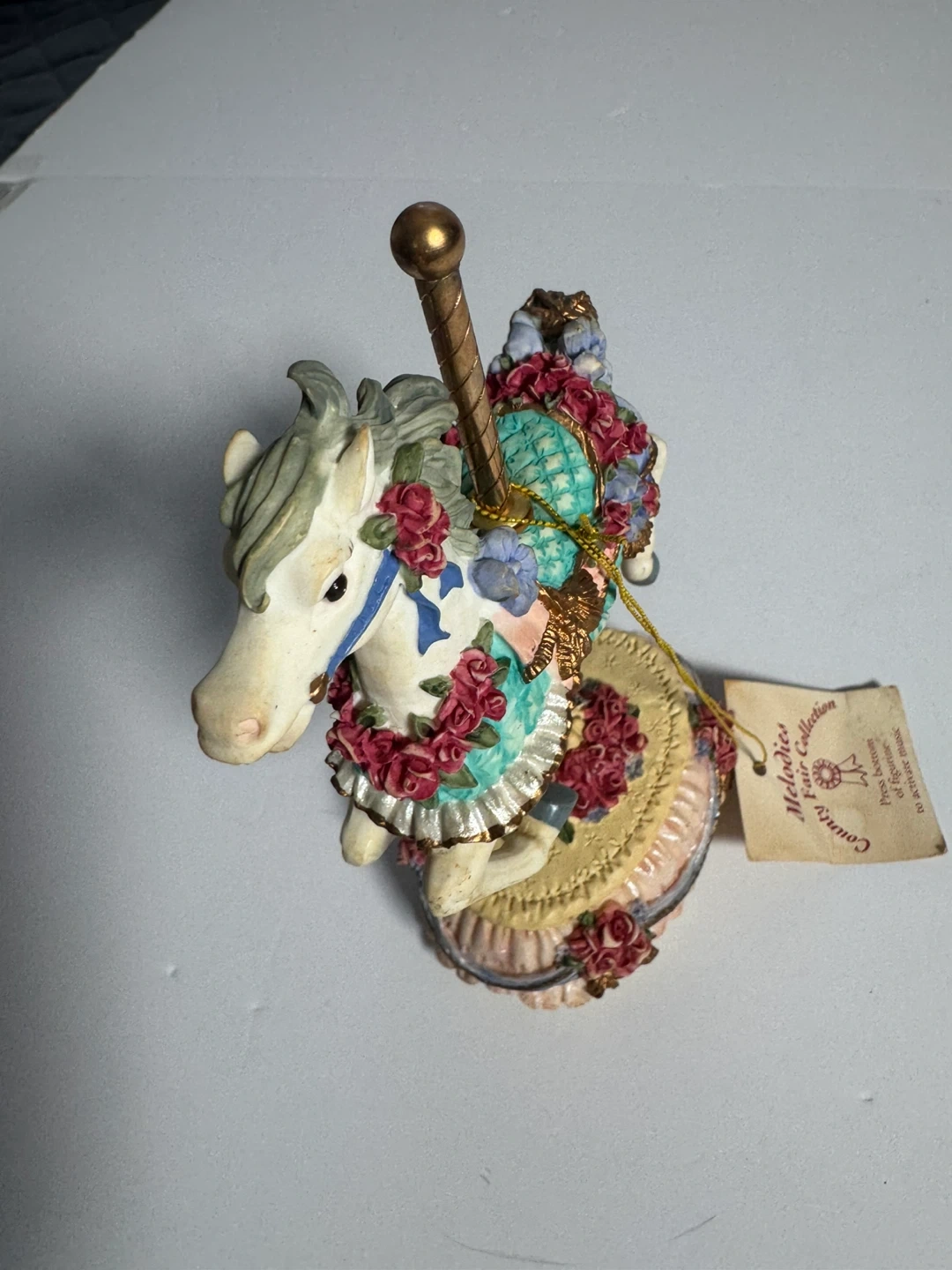 This charming carousel horse music box is from the Melodies Fair Collection. It's decorated with beautiful floral accents and plays music when the bottom is pressed. A lovely decorative piece!
