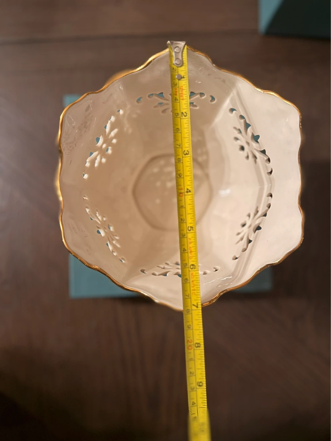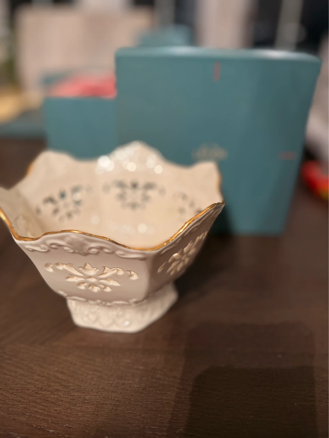 This is a beautiful decorative bowl with an intricate design and a gold rim. It measures approximately 5 inches in diameter and 4 inches in height. The detailed cut-out pattern adds a touch of elegance. It's perfect for holding small items or as a standalone decorative piece!