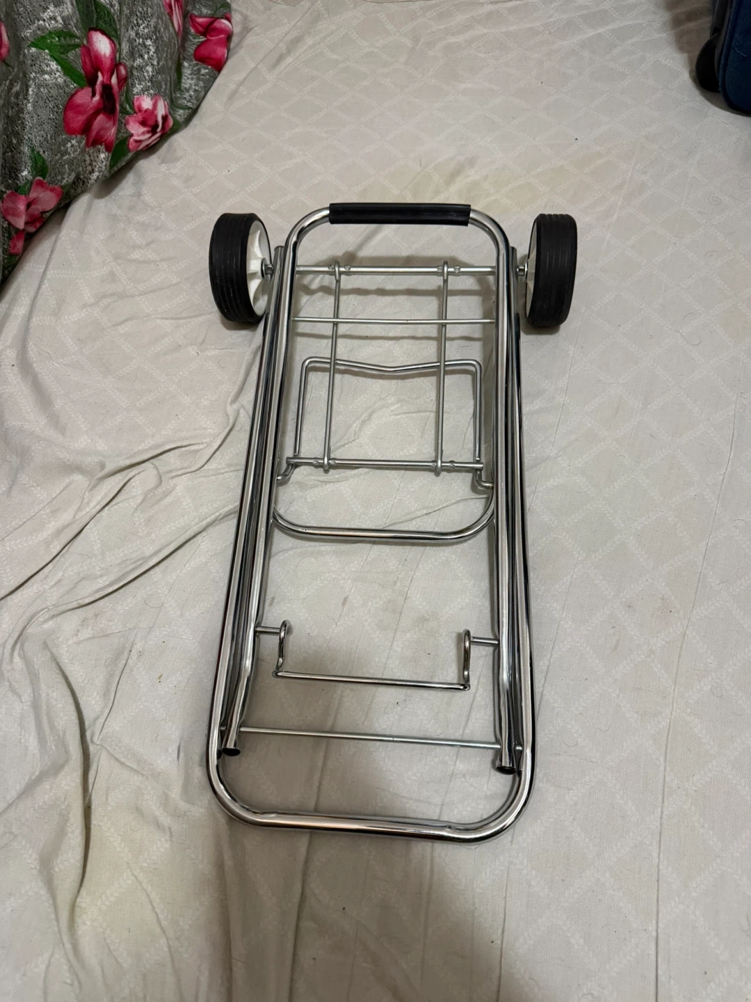This is a folding luggage cart with two wheels and a handle. It's made of metal with a rubber grip on the handle. It folds flat for easy storage. This cart would be useful for travellers needing to transport luggage.