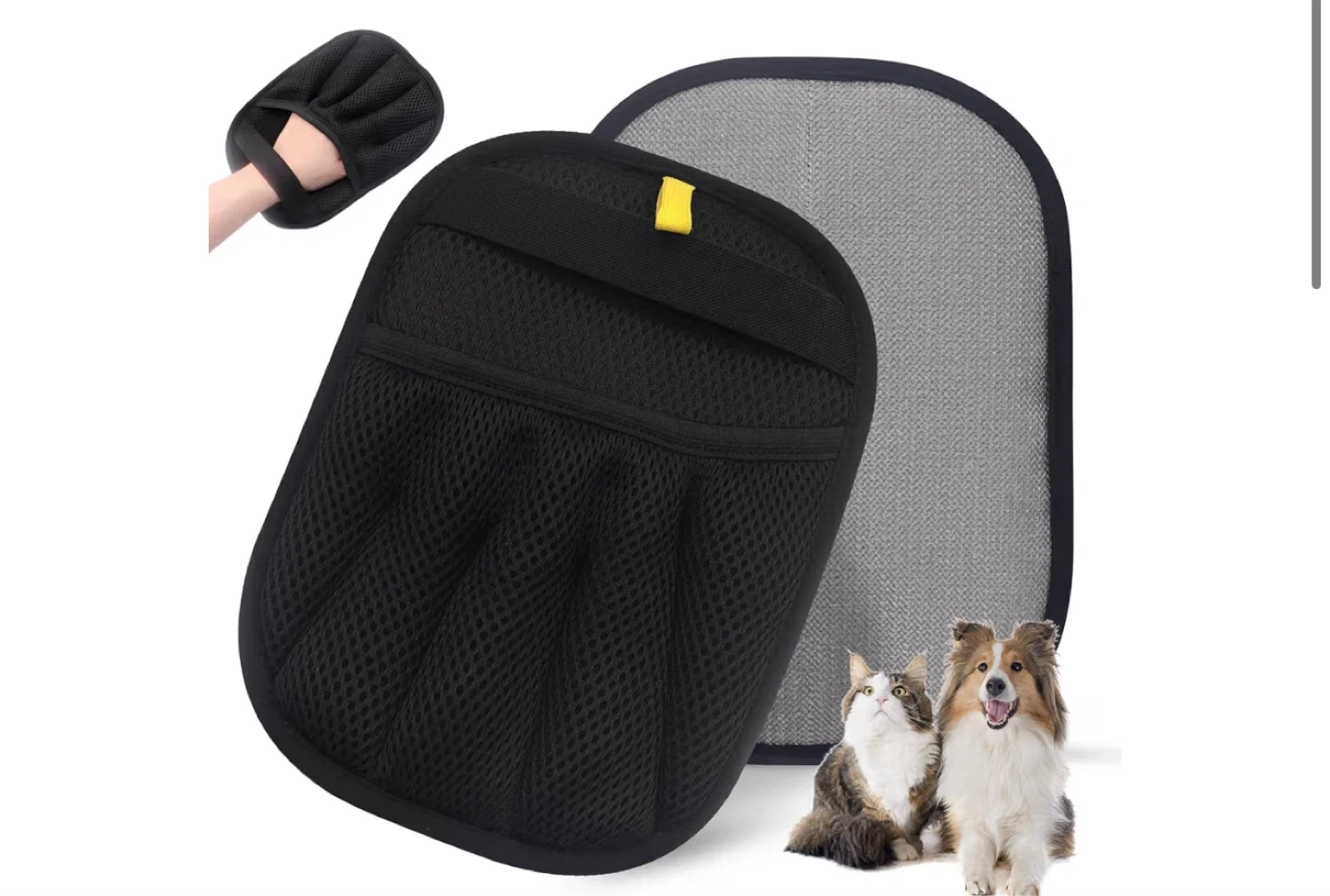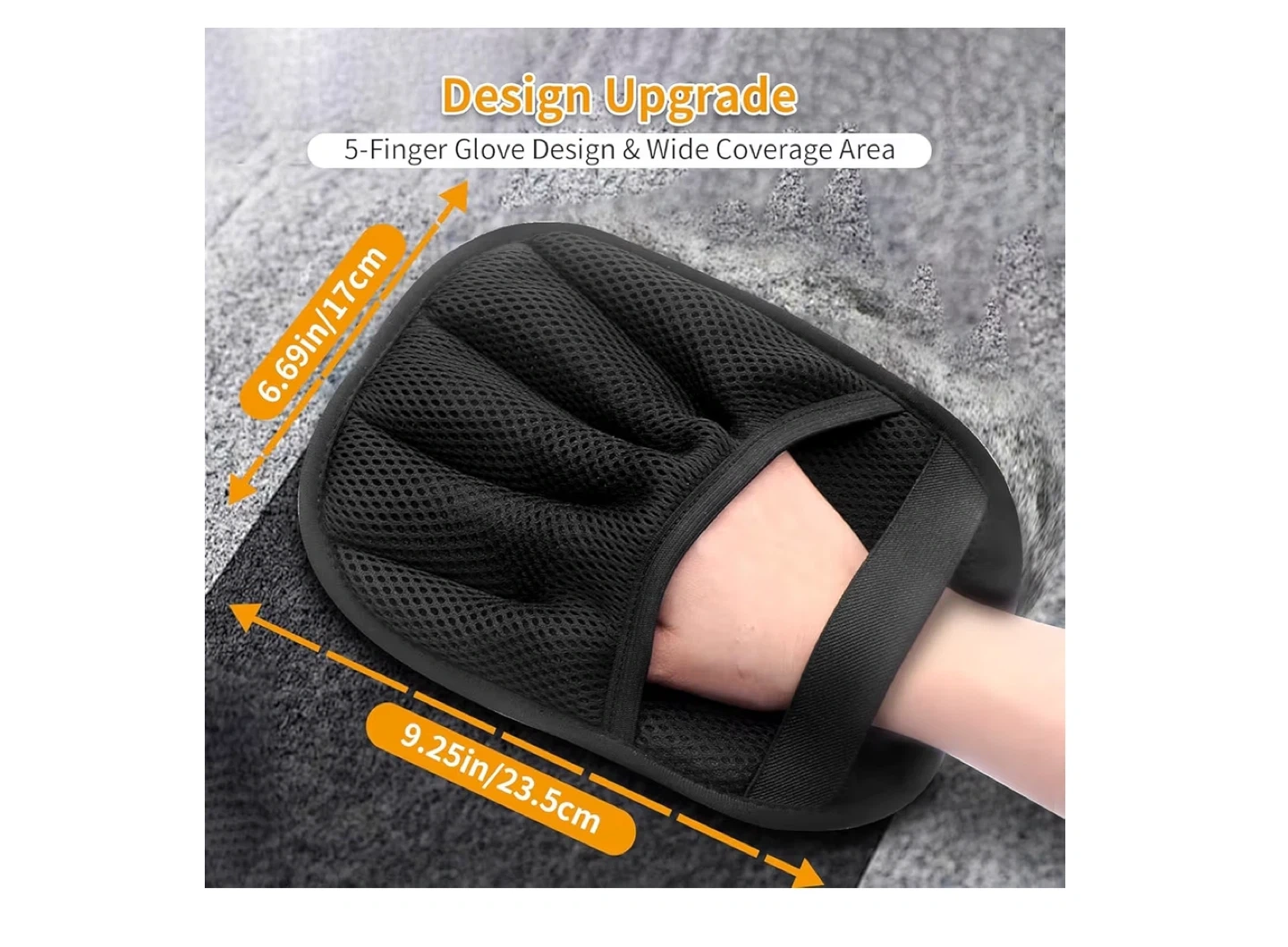 This black pet grooming glove mitt features a 5-finger design for wide coverage. It's made of breathable mesh material for comfort. Dimensions are 9.25in/23.5cm by 6.69in/17cm. This glove is great for grooming pets with fur.