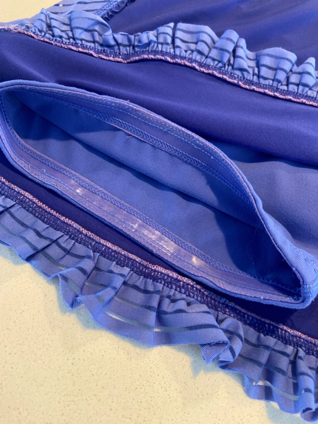 The skirt features decorative ruffled trim along the hem and patterned side panels