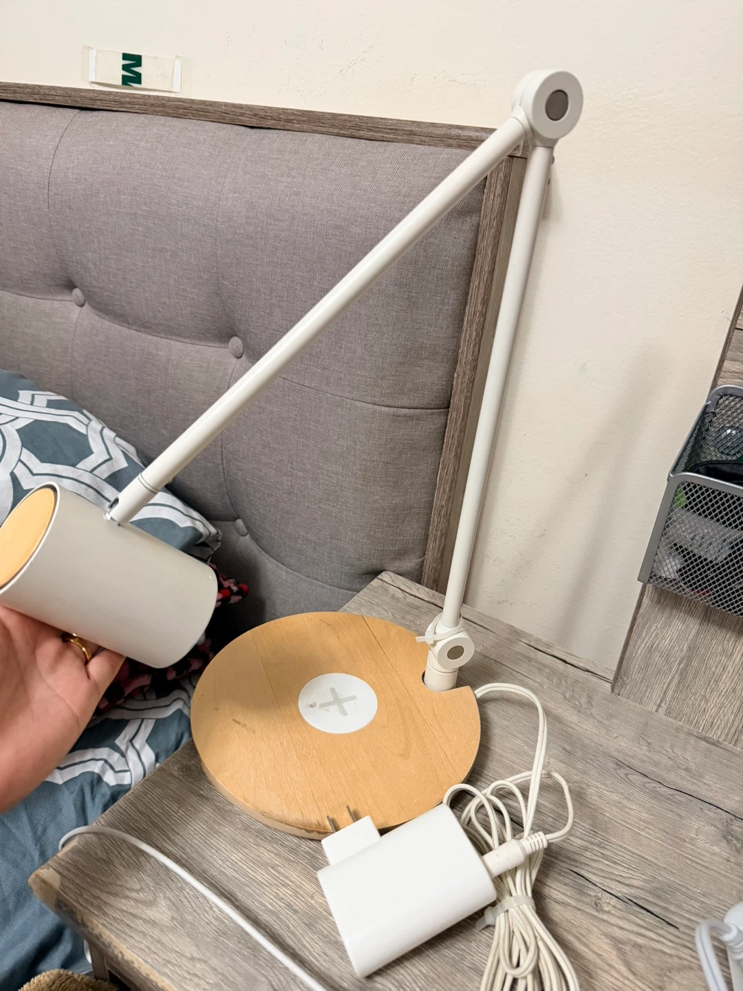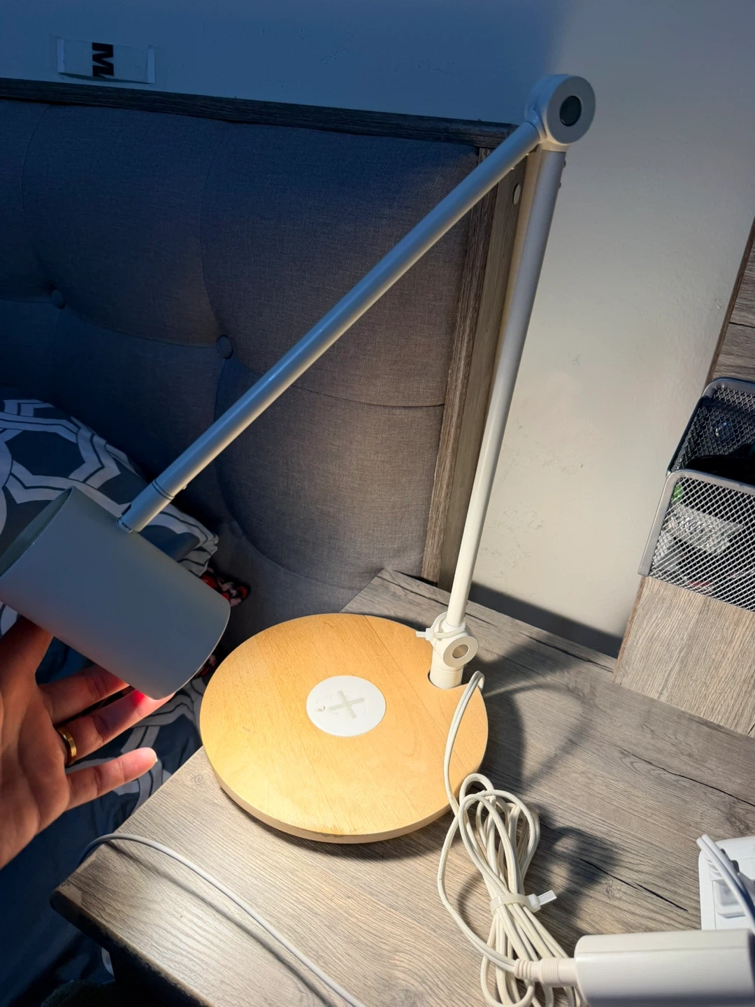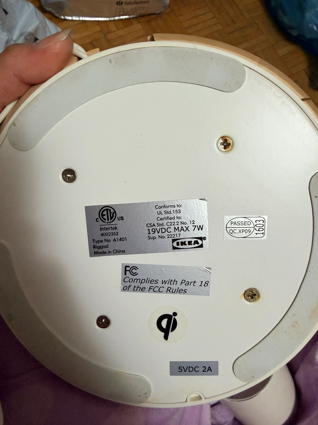 This IKEA LED desk lamp features a built-in wireless charging pad for your devices. It's white with a wood-look base and has an adjustable arm for optimal lighting. The lamp requires 19VDC max 7W and has a 5VDC 2A output for charging. Also has usb port